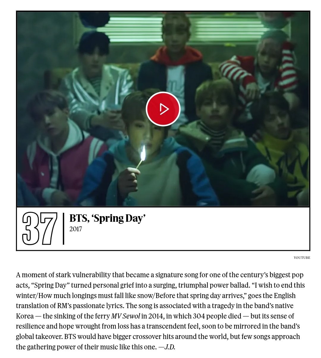 ✨Rolling Stone ยกย่องให้ "Spring Day" ของ BTS เป็นหนึ่งในเพลงที่ยิ่งใหญ่ที่สุดแห่งศตวรรษที่ 21 ที่อันดับ #37