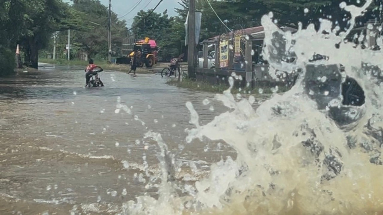 ขณะที่ตั้งแต่เช้า พนักงานโรงงานในนิคมเกตุเวย์ไม่สามารถออกมาทำงานได้ รวมถึงน้องๆ นักเรียนที่อยู่ระหว่างใกล้ปิดเทอม ชาวบ้านด้านในออกมาไม่ได้เพราะน้ำหลากไหลแรงท่วมสูง