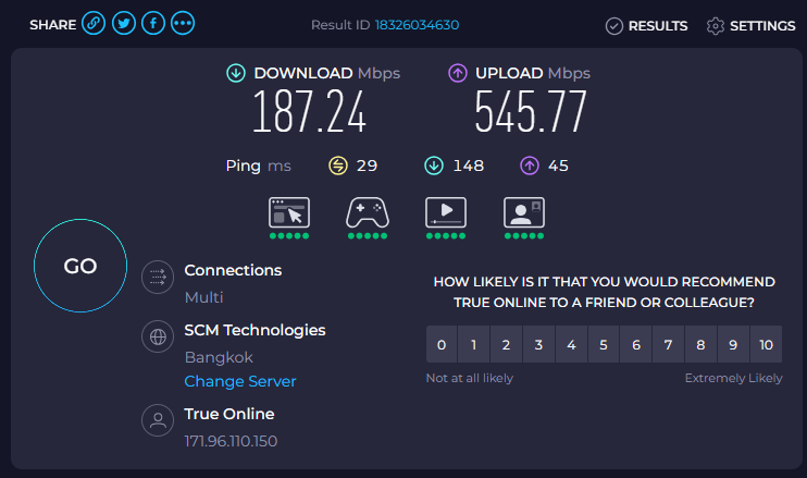 คือผมใช้เน็ตบ้านของ true ควาวเร็ว Download 1Gbps/Upload 500Mbps คือผมสงสัย ว่าความเร็ว ปกติ ทั้งความเร็ว download/Upload จะอยู่ที่ประมาณเท่าไรครับ ***ผมลอง test หลายเว็บเลยครับ ใช้ เครื่อง pc เค