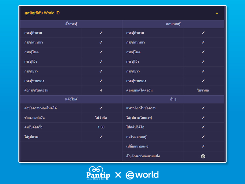 4. ความพิเศษอื่น ๆ เพื่อน ๆ สามารถเปลี่ยนนามแฝง สร้างรายได้จาก Affiliate กดโหวตกระทู้ซึ่งมั่นใจได้ว่าเป็นคะแนนที่มาจากมนุษย์จริงๆ ไม่ใช่บอท และยังมีสัญลักษณ์โลโก้ World หลังนามแฝง เพื่อยืนยันความมนุษย์อีกด้วย