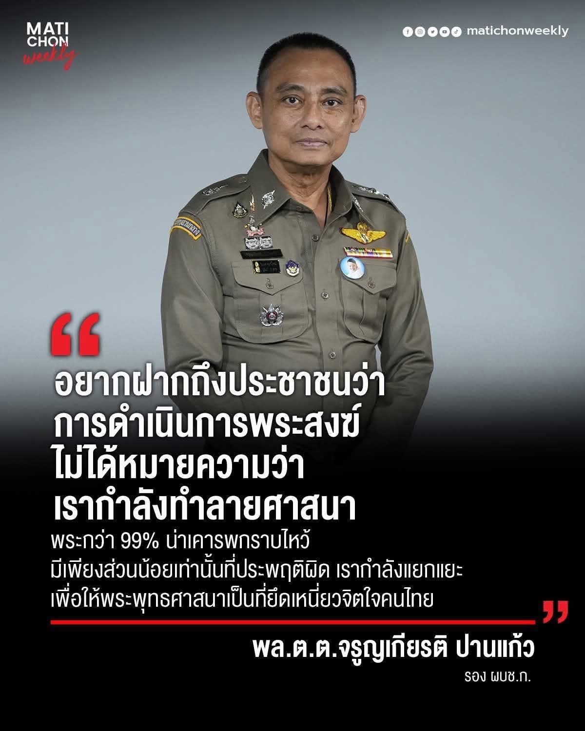 “ผมอยากฝากถึงประชาชนว่า การดำเนินการพระสงฆ์ไม่ได้หมายความว่าเรากำลังทำลายศาสนา พระกว่า 99% น่าเคารพกราบไหว้ มีเพียงส่วนน้อยเท่านั้นที่ประพฤติผิด เรากำลังแยกแยะ เพื่อให้พระพุทธศาสนาเป็นที่ยึดเหนี่ยวจิตใจคนไทย” บิ๊กเต่ากล่าว