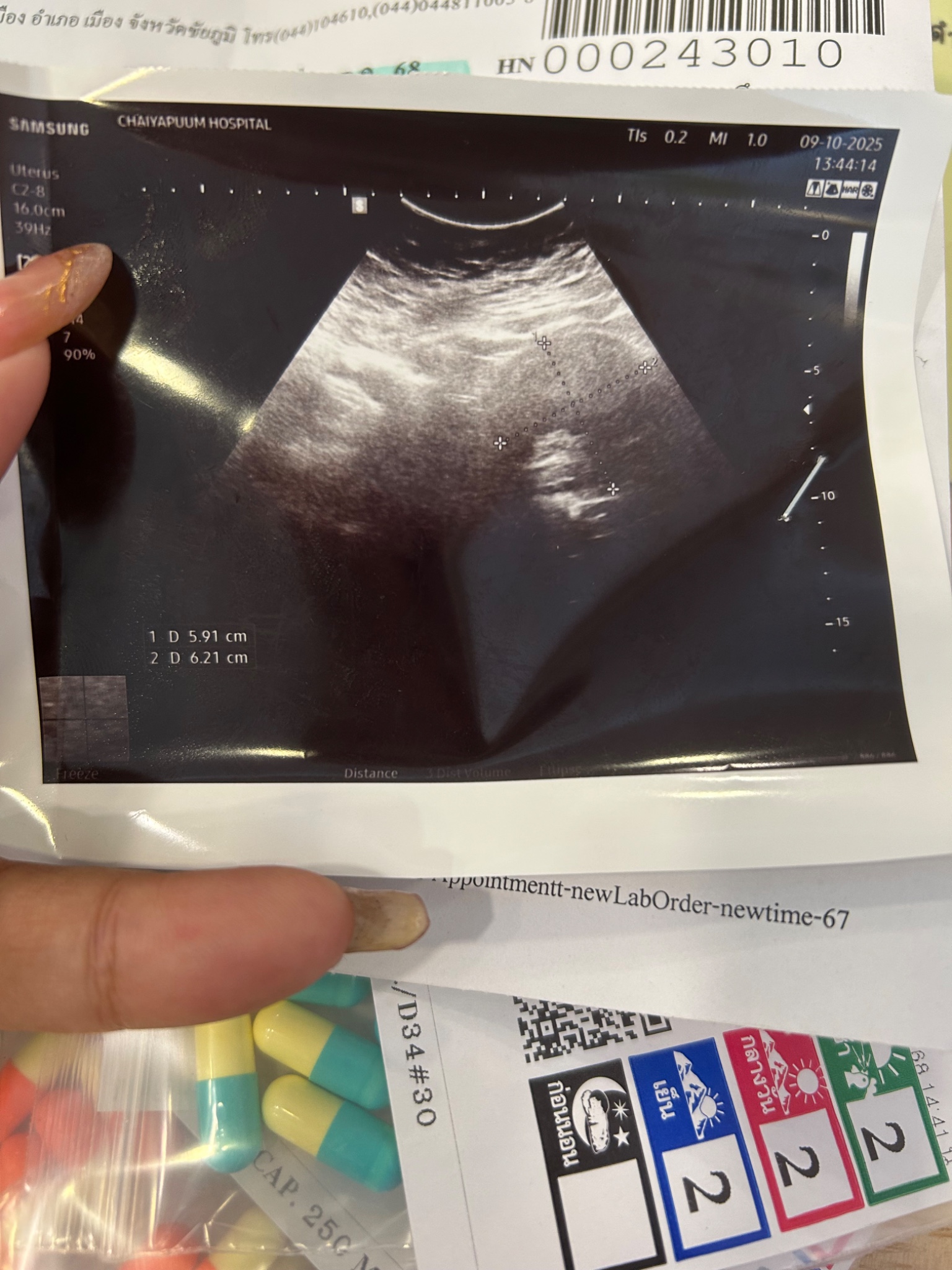 ขอถามเป็นความรู้หน่อยคะ พอดีว่าเป็นประจำเดือน2เดือนคะมาแบบทุกๆวัน แล่วเป็นลิ่มเลือดออกมาเป็นก้อนมาตลอด2เดือแล้วมีอาการปวดท้องหน่วงท้องตลอดมาวันนี้เหมือนจะวูบเหนื่อยง่ายหลังๆมานี้วันนี้เลยเข้าตรวจที่โรงบาลคะ อัลตร้าซาวแล้ว หมอคิดว่าอาจจะเป็น ระหว่างซีสกับเยื่อบุโพรงมดลูกเจริญผิดที่คะ ช่วยดูฟิล์มแล้วบอกตามที่ดูหน่อยได้มั้ยคะว่ามีสิทธิ์จะเป็นอะไรมากกว่ากันคะ แล้ววันนี้หมอตรวจภายในด้วยคะทั้งที่เป็นประจำเดือนอยู่แล้วปวดท้องมากๆด้วยคะหลังออกจากห้องตรวจต้องกลีบไปที่โรงบาลอีกมั้ยคะหรือว่าต้องรอดูไปก่อน ก้อนในมดลูกมีขนาดประมาณ5-6ซมฺได้คะ