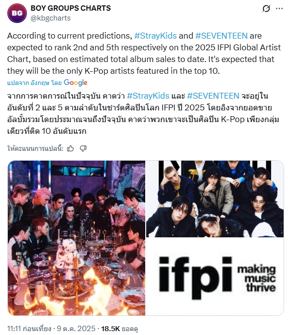 🔥 Stray Kids คาดว่าจะอยู่ในชาร์ตศิลปินโลก IFPI ประจำปี 2025 อิงจากยอดขายอัลบั้มโดยเป็น K-Pop เพียง2วงที่อยู่10อันดับแรก