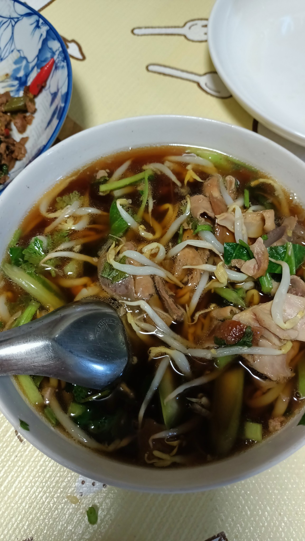 มื้อเย็นครับ กะเพราเนื้อ กับเกาเหลาเป็ด และไข่ดาว