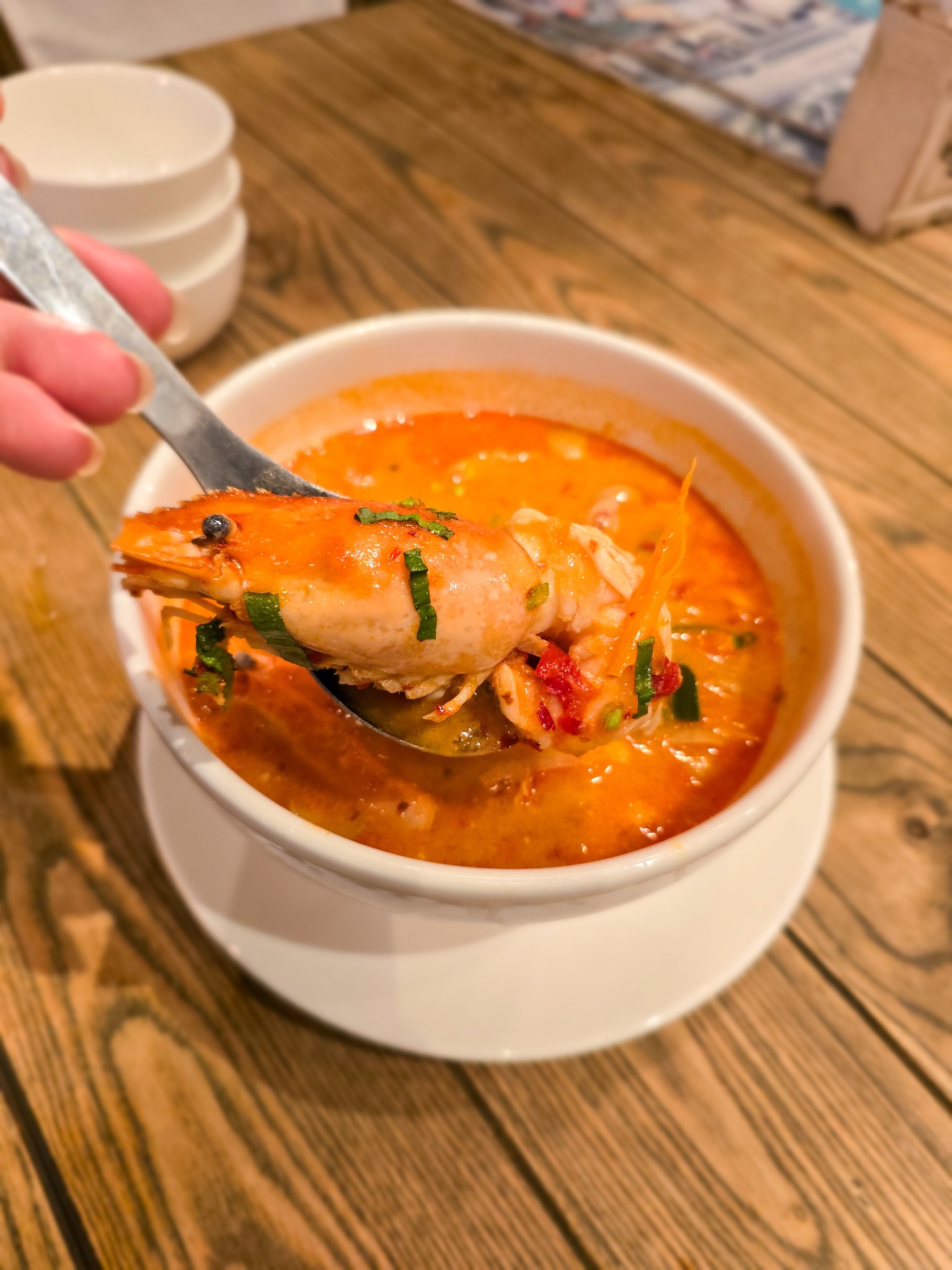 ถัดมาคือ ต้มยำกุ้งแม่น้ำน้ำข้น ที่ได้กุ้งแม่น้ำชามละ 3 ตัว ซุปต้มยำจัดจ้านถึงเครื่องครับ สั่งเบิ้ลไป 2 ชามเลย