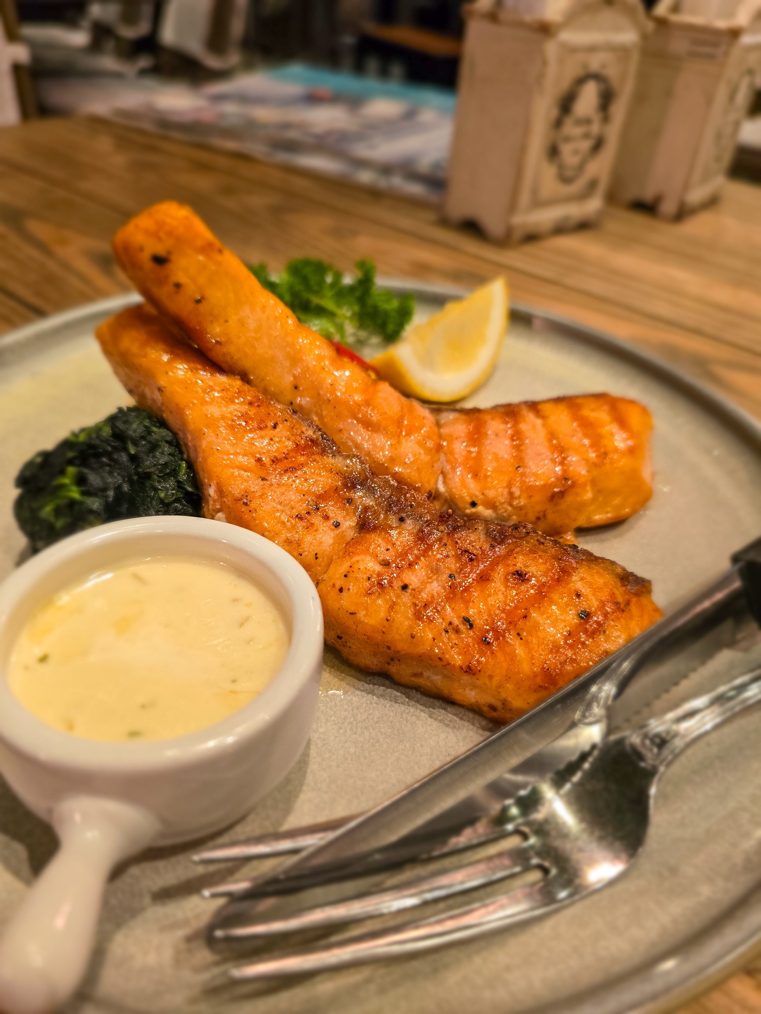 ส่วน แซลมอนย่าง ครีมซอสมะนาว รู้สึกว่าทำมา overcooked ไปหน่อย เนื้อเลยแห้งครับ
