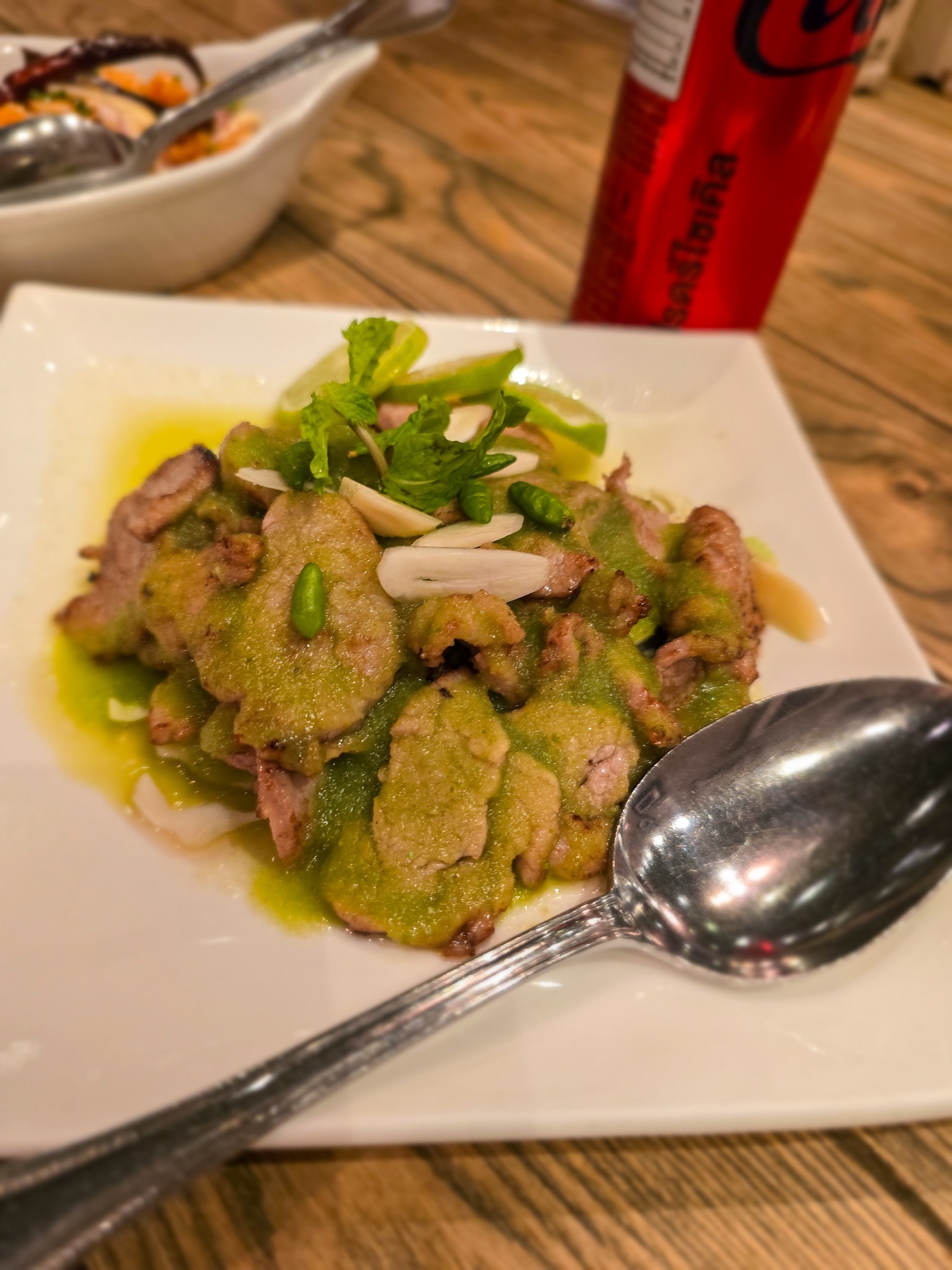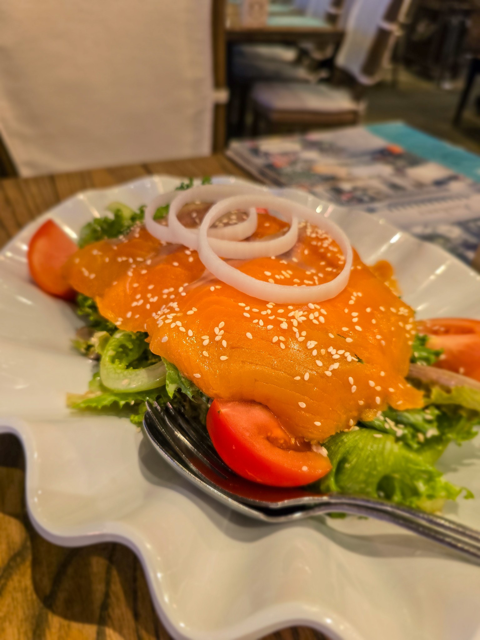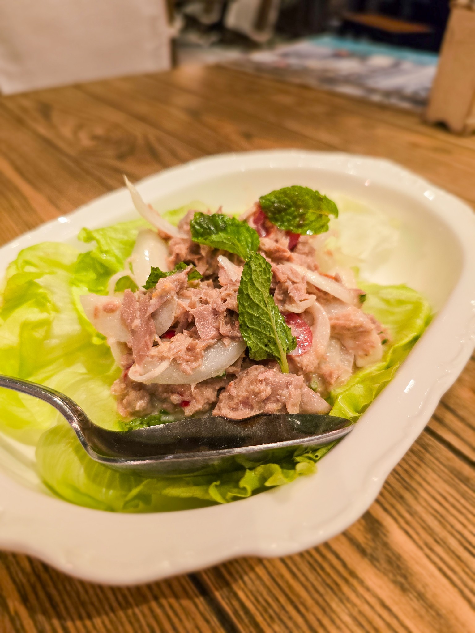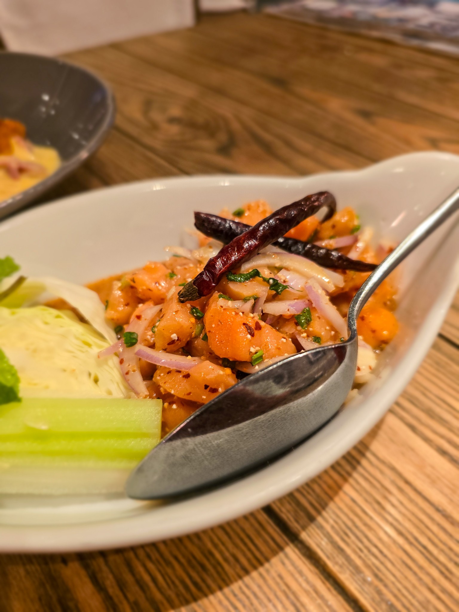 ส่วนอาหารไทยจัดจ้านต้องยกให้ ลาบปลาแซลม่อน (แซลมอนดิบหั่นเต๋า) ปรุงรสเข้มข้น