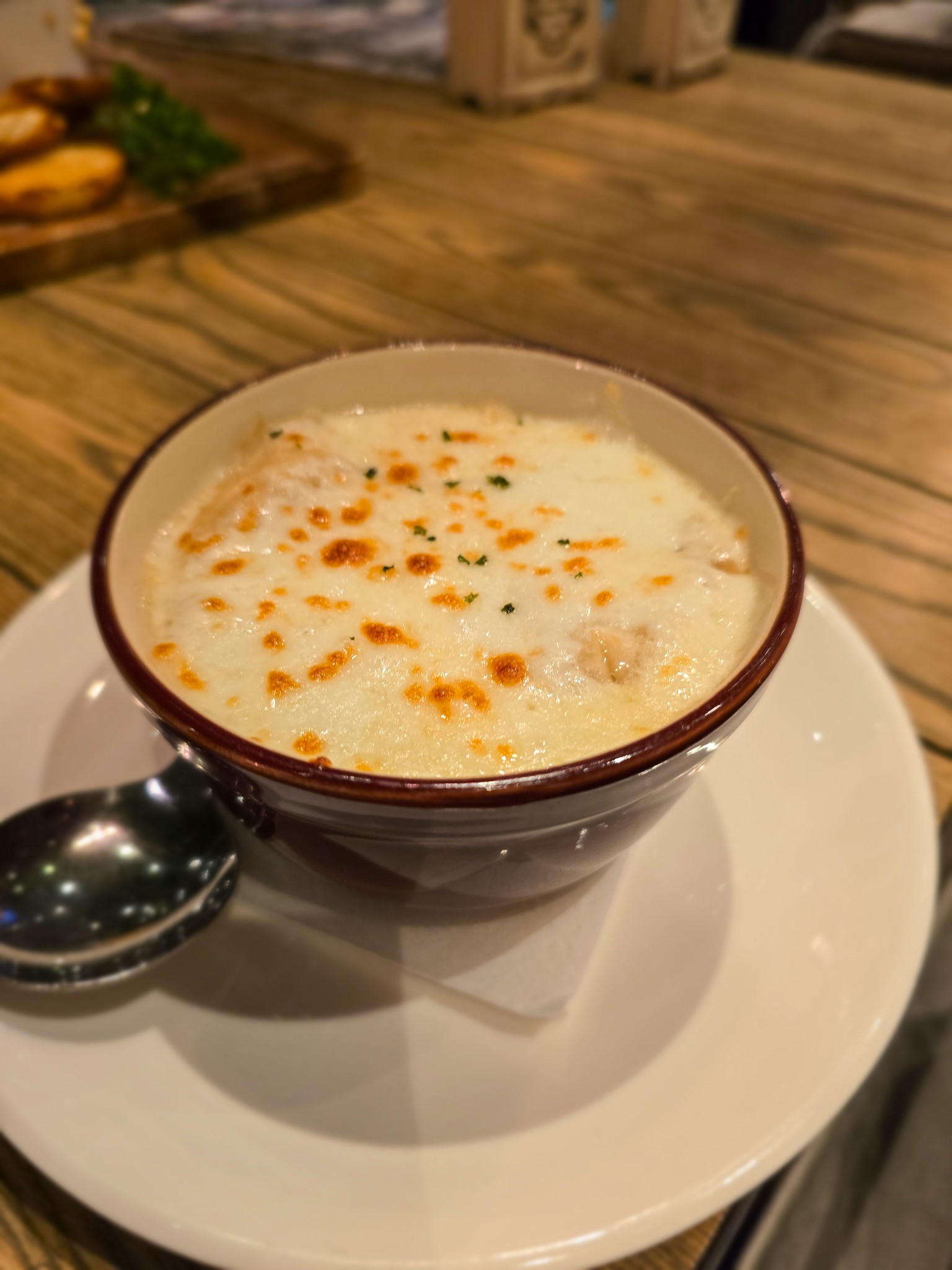 และ ซุปหัวหอม ที่ได้ซุปค่อนข้างน้อย เพราะมีขนมปังกับชีสโปะด้านบนครับ