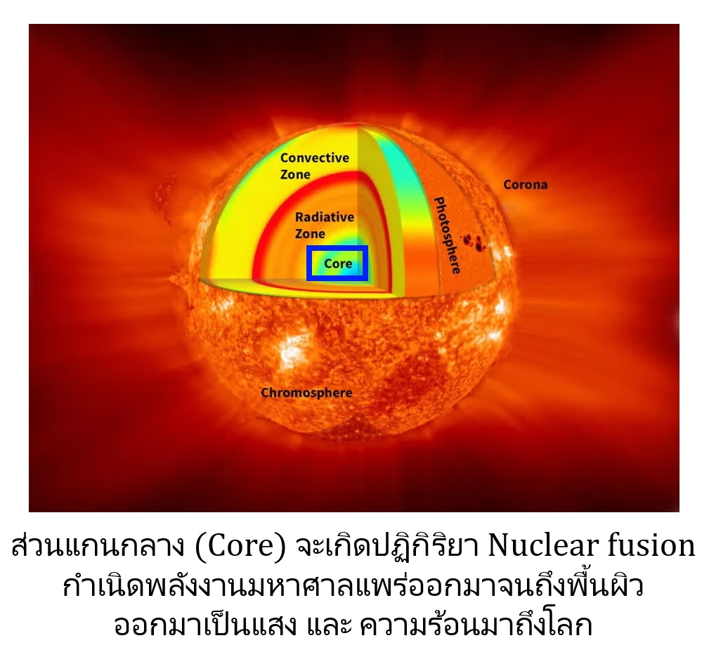 ปฏิกิริยา Nuclear fusion นายดวงอาทิตย์เป็นสิ่งมหัศจรรย์มาก เพราะมันเกิดอย่างต่อเนื่องนานมาเกือบ 5,000 ล้านปีแล้ว และจะมีต่อไปอีกประมาณ 3,000 ล้านปี .... ถ้าเทียบกับปฏิกิริยา Nuclear fusion แบบที่มนุษย์ทำได้บนโลกก็คือระเบิด Nuclear fusion อย่างในคลิปนี้ (เป็นภาพจำลอง) การระเบิดของอาวุธนิวเคลียร์ในคลิปนี้ ปฏิกิริยา Nuclear fusion จะเกิดขึ้นนานเพียง 0.01 วินาทีเท่านั้นครับ เทียบกับดวงอาทิตย์ซึ่งเกิดขึ้นนานมา 5,000 ล้านปีอย่างต่อเนื่องจึงเป็นเรื่องที่น่าทึ่งเกินจินตนาการ ที่มันเป็นเช่นนี้ได้เพราะว่าปริมาณ Hydrogen ในดวงอาทิตย์มีมหาศาลมาก หากเทียบกันแล้วปริมาณของเชื้อเพลิง Hydrogen ในระเบิดนิวเคลียร์ที่เรียกว่า "Deuterium" มีปริมาณแค่ 60 - 200 กิโลกรัม แต่ในดวงอาทิตย์มี Hydrogen มากถึง 2 × 1030 กิโลกรัม