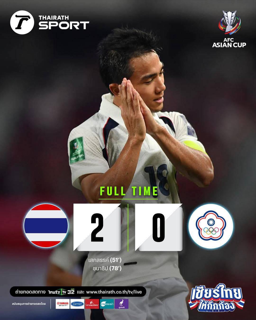 ทำให้ “ไทย” เก็บสามคะแนนเต็ม มีเพิ่มเป็น 6 คะแนน จาก 3 นัด ส่วน “ไต้หวัน” ไร้แต้มติดมือกลับบ้าน และไม่มีแม้แต่คะแนนเดียว จากการแพ้รวดทั้ง 3 นัด
