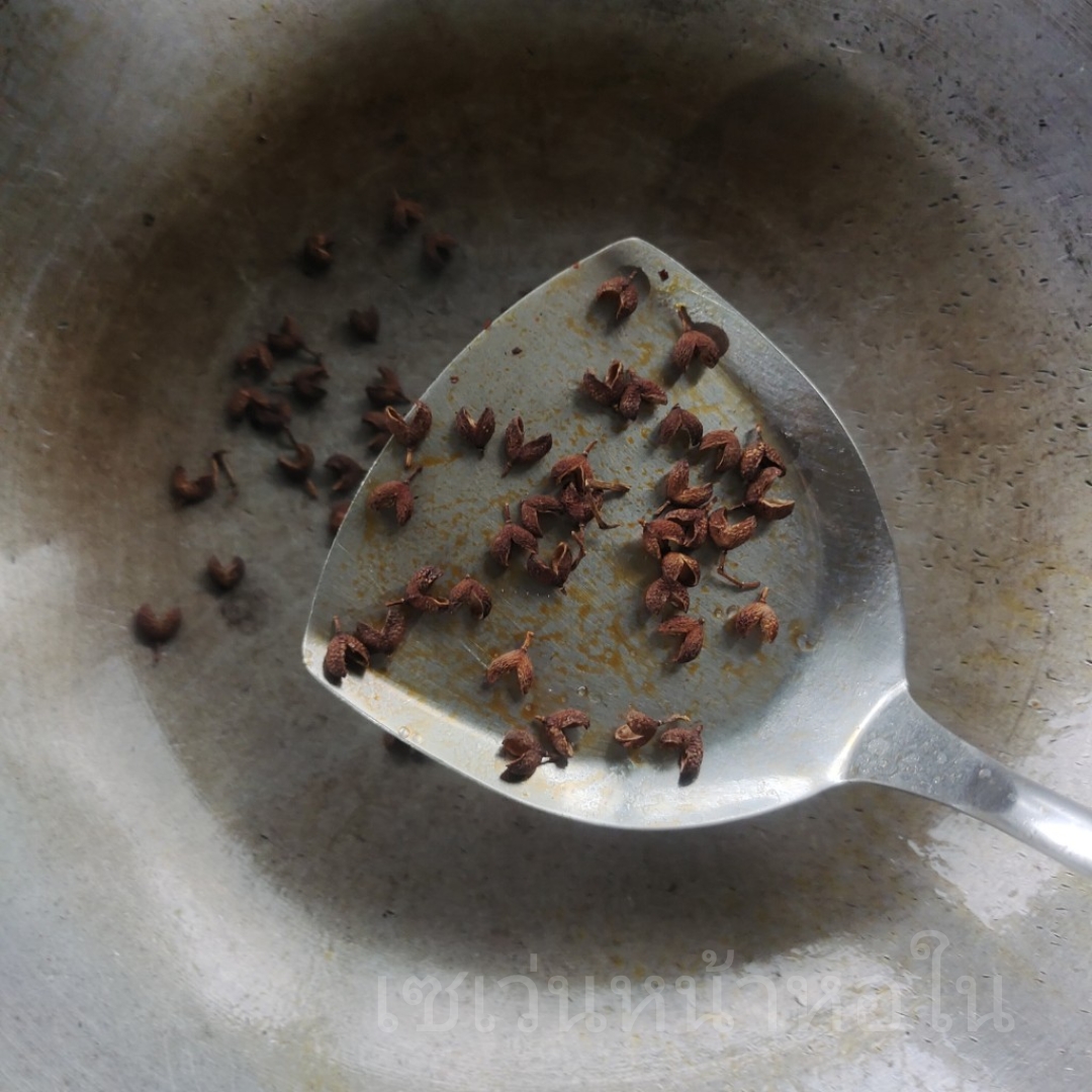 นำส่วนผสมทุกอย่างหั่นเป็นชิ้นเล็กๆ แล้วนำไปคั่วในกระทะให้หอมๆ