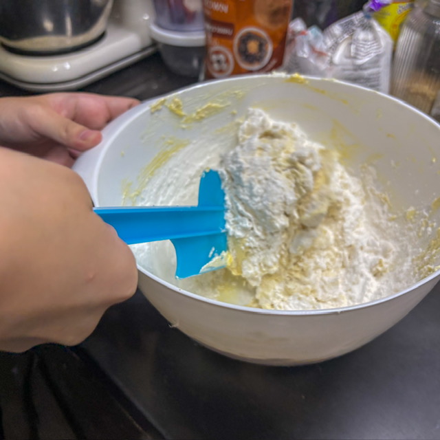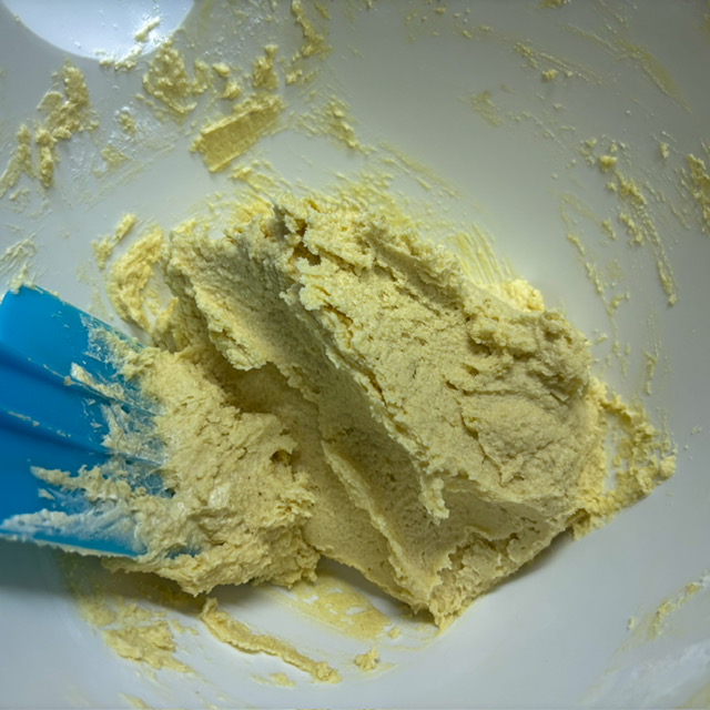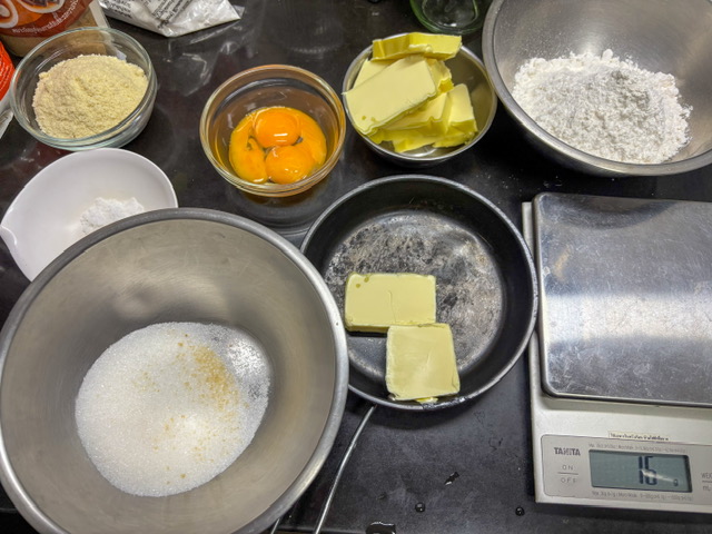 พอขึ้นขาวๆแล้วก็ใส่เกลือ brown butter และ ไข่ไก่ลงไป อัลมอนด์บด ตามลงไปตะล่อมให้เข้ากัน ใส่แป้ง อย่ากวนจนเหนียวหรือออกแรงกวนซะขนาดนั้นนะครับ เอาแค่เข้ากัน