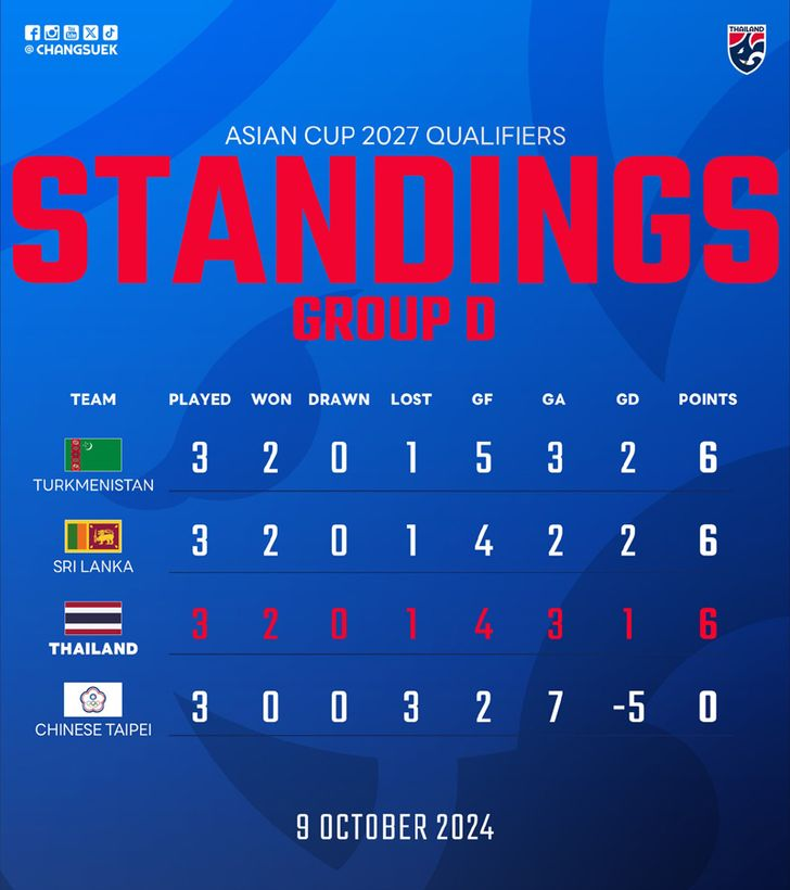 สรุปตารางคะแนน "ทีมชาติไทย" หลังเปิดบ้านชนะ ไต้หวัน คัดเอเชียนคัพ 2027