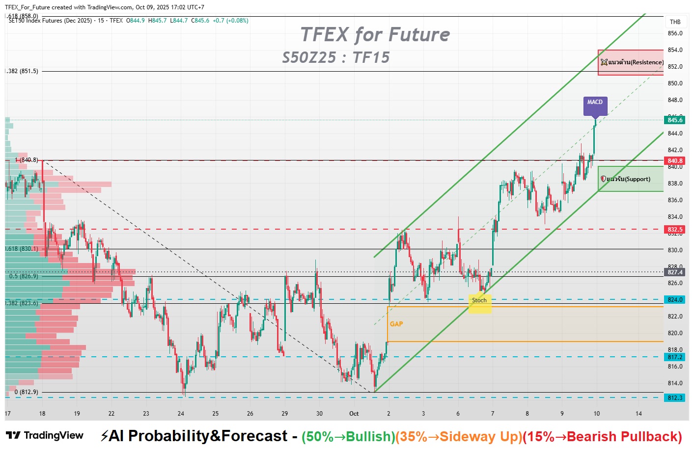 หากเบรก 854 ได้ → Upside เปิดถึง 858 (Fibo 161.8%)
