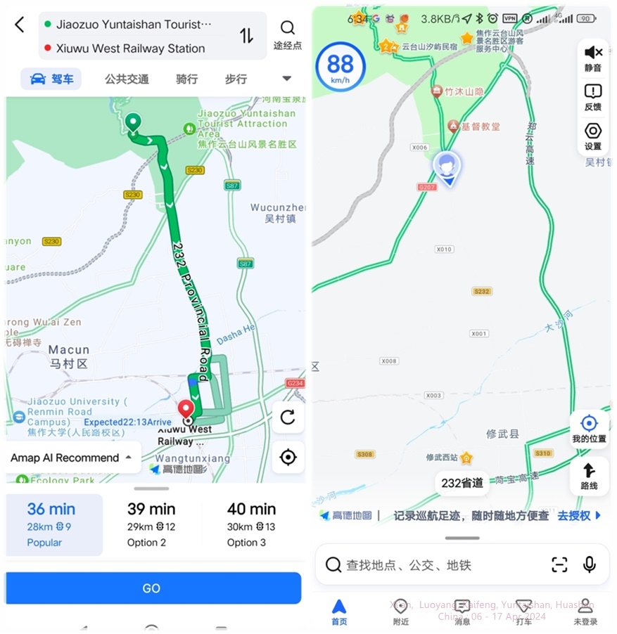 ใน Amap เส้นทางวิ่งจาก หมู่บ้านอั้นฉ่าง ในหยุนไถซาน ไปสถานีรถไฟซิ่วหวู่ตะวันตก