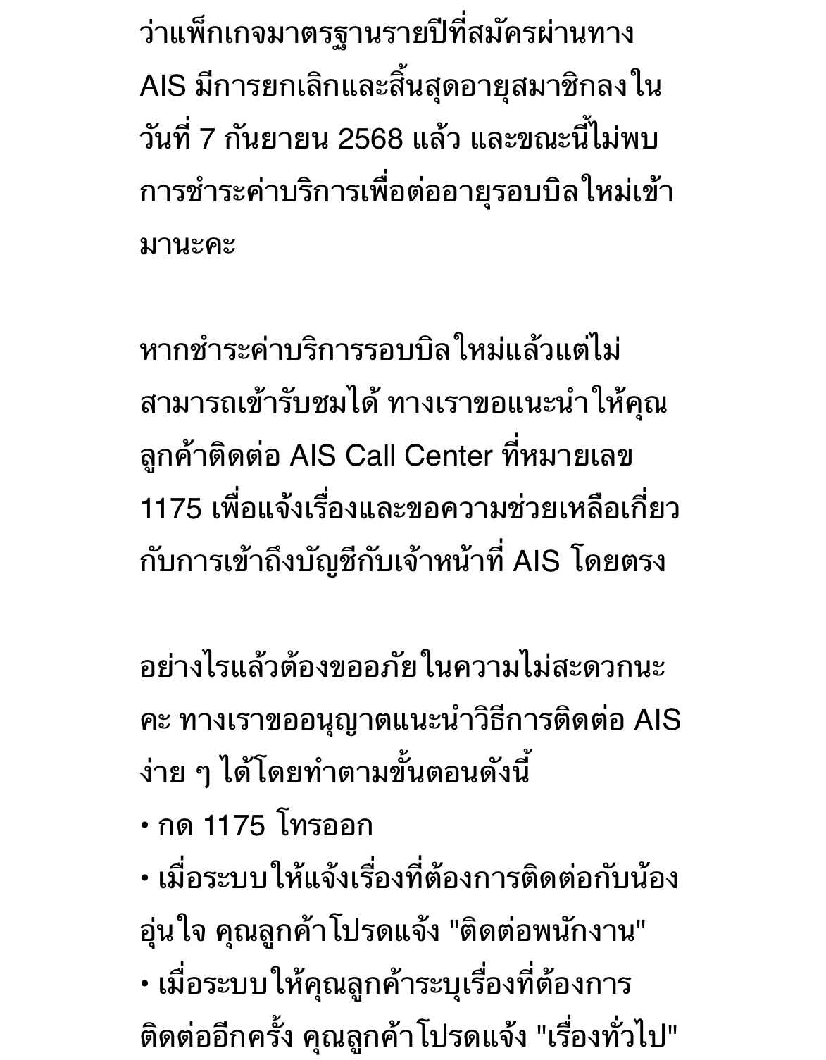 กดยกเลิกแพ็กเกจในแอพ my ais แล้วมีข้อความแจ้งมาว่า “ใขออภัยไม่สามารถทำรายการได้ในขณะนี้ กรุณาติดต่อ AIS Call Center โทร 1175” หลังจากติดต่อไป ก็ส่งลิงค์มาให้กดยกเลิกเองใน my ais อีก