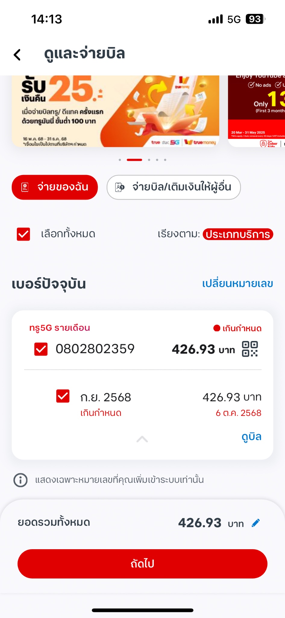 ผมจ่ายเงินไปแล้ว 1 รอบบิลแต่มันไม่ตัดมันยังต้้างชำระเท่าเดิมผมงง โดนกินตังฟรีหรอครับ ในแอปธนาคารมันก็ยอดออโอนออกแต่ เงินค้างชำระเท่าเดิมใน app true ผมละงง