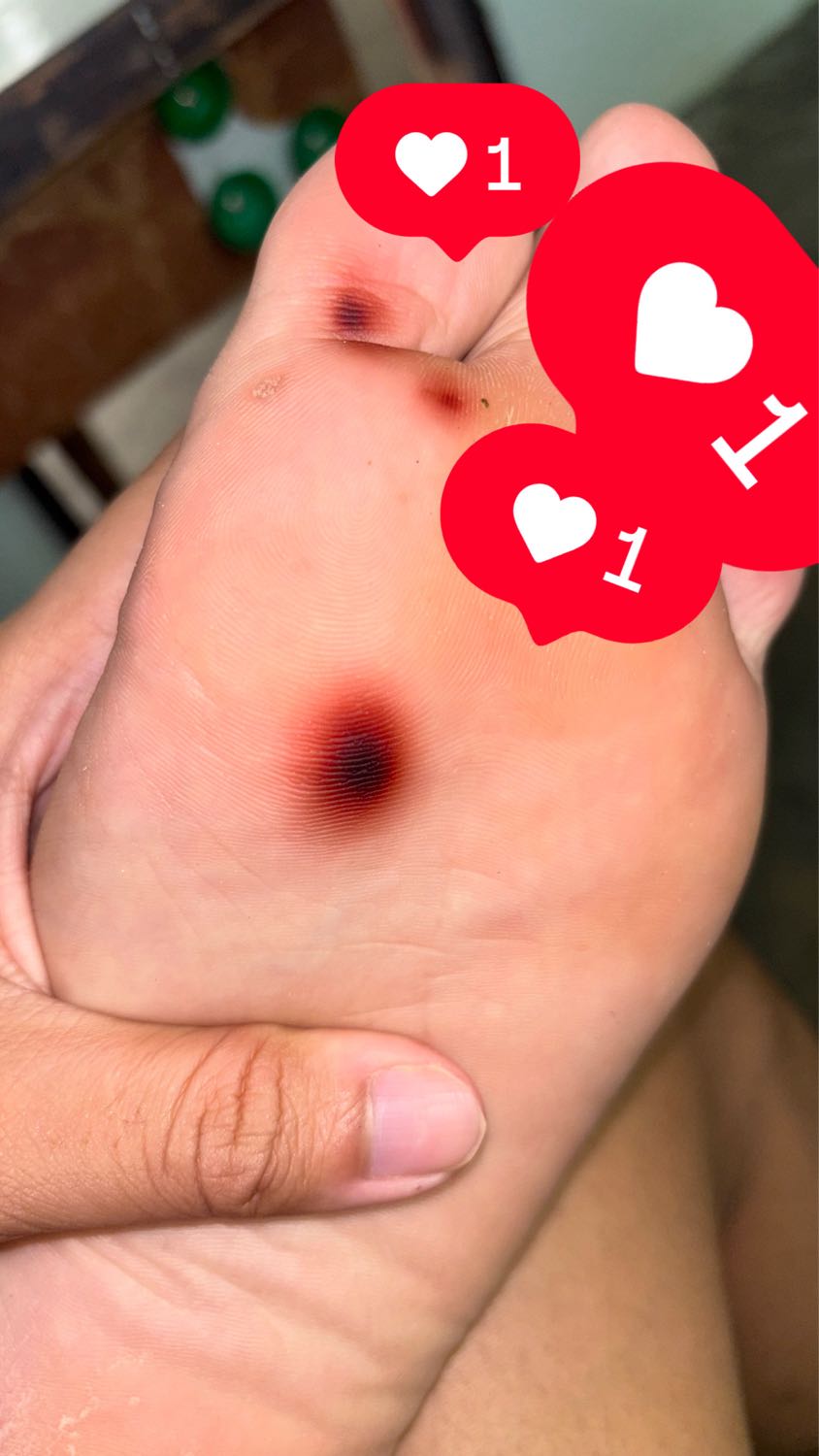 *ขออภัยสำหรับรูปภาพนะคะ* อยากทราบว่ารอยแบบนี้คือโดนอะไรต่อยมั้ยคะ ตอนแรกเข้าใจว่าเหยียบอะไรมาแต่ล้างไม่ออก แต่ก็ไม่รู้สึกเจ็บใต้ฝ่าเท้า