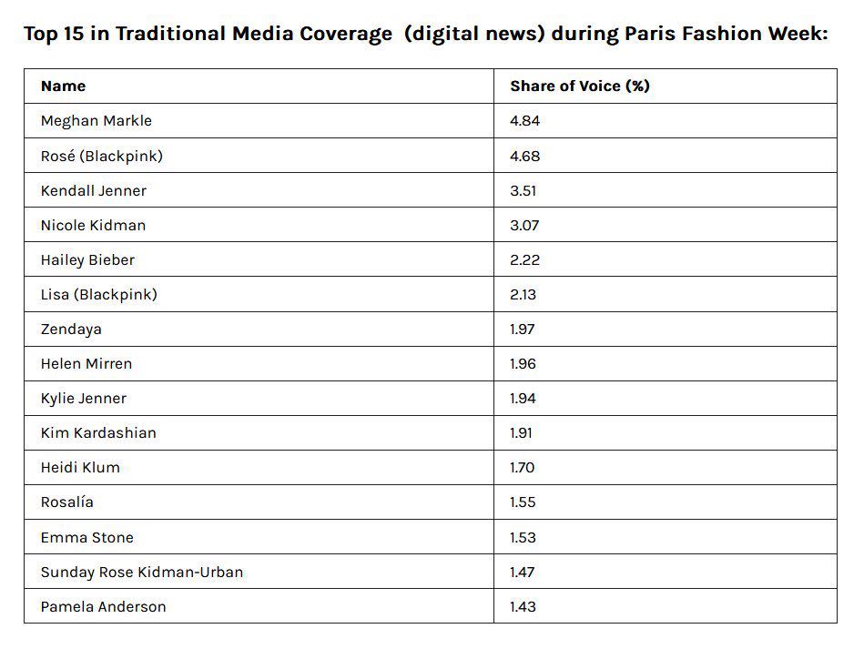 โรเซ่ (BLACKPINK) (4.68%) ในฐานะแบรนด์แอมบาสเดอร์ระดับโลกของ Saint Laurent โรเซ่ทำหน้าที่เชื่อมโยงระหว่างพลังโซเชียลมีเดียมหาศาลของ K-pop กับความน่าเชื่อถือของวงการแฟชั่นแบบดั้งเดิม คะแนนของเธอที่ใกล้เคียงกับเมแกน มาร์เคิล (ห่างกันเพียง 0.16 %) แสดงให้เห็นว่าอิทธิพลได้ขยายออกไปไกลจนถึงการได้รับการยอมรับในวงการแฟชั่นอย่างจริงจัง ความสำเร็จในฐานะศิลปินเดี่ยวของโรเซ่ ประกอบกับสไตล์ส่วนตัวที่ดูหรูหราและมีรสนิยม ทำให้เธอเป็นที่สนใจของสื่อต่าง ๆ ที่มุ่งเน้นผู้อ่านที่มีฐานะดีและใส่ใจแฟชั่น แม้ผู้อ่านกลุ่มนั้นอาจจะไม่ได้ติดตาม K-pop บนโซเชียลมีเดียก็ตาม