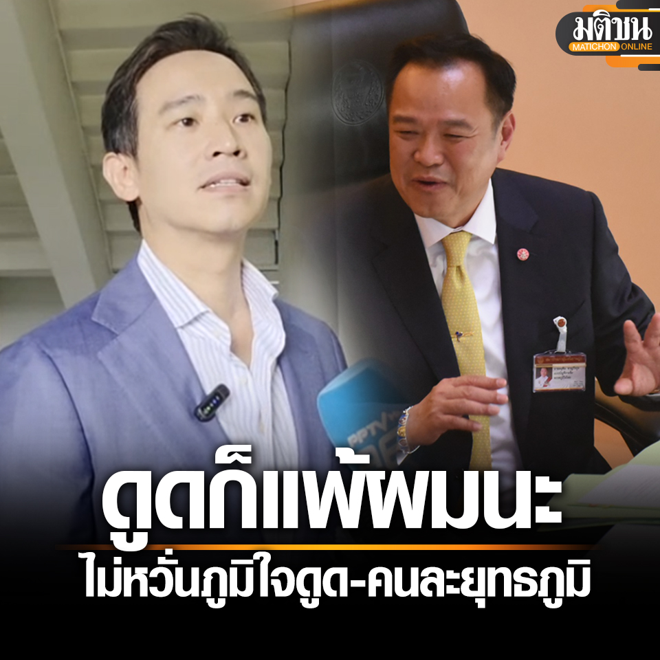 “พิธา” ลั่น “ภูมิใจดูด” ก็เคยแพ้ผม เตือน “อนุทิน” อย่าให้การเมืองนำบ้านเมือง แนะ “พูดแล้วทำ” ให้ได้แบบสโลแกนพรรค ป้อง “พรรคประชาชน”ไม่ใช่ฝ่ายค้ำ มองการเมืองไทยยุคนี้คือ “เฉพาะกิจ”แนะ เร่งกู้ภาพลักษณ์ด้วยผลงาน