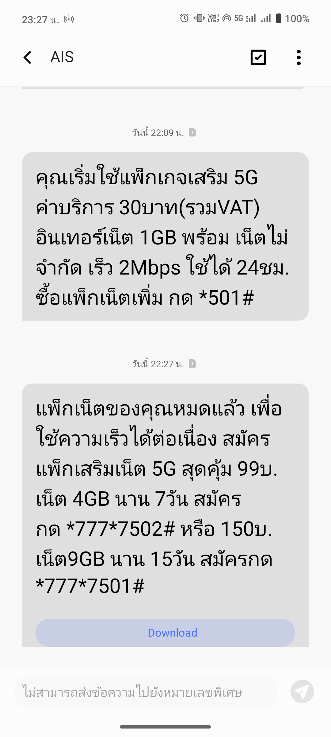 เติมแพ็คเกจเน็ตแต่ข้อความไม่เข้า