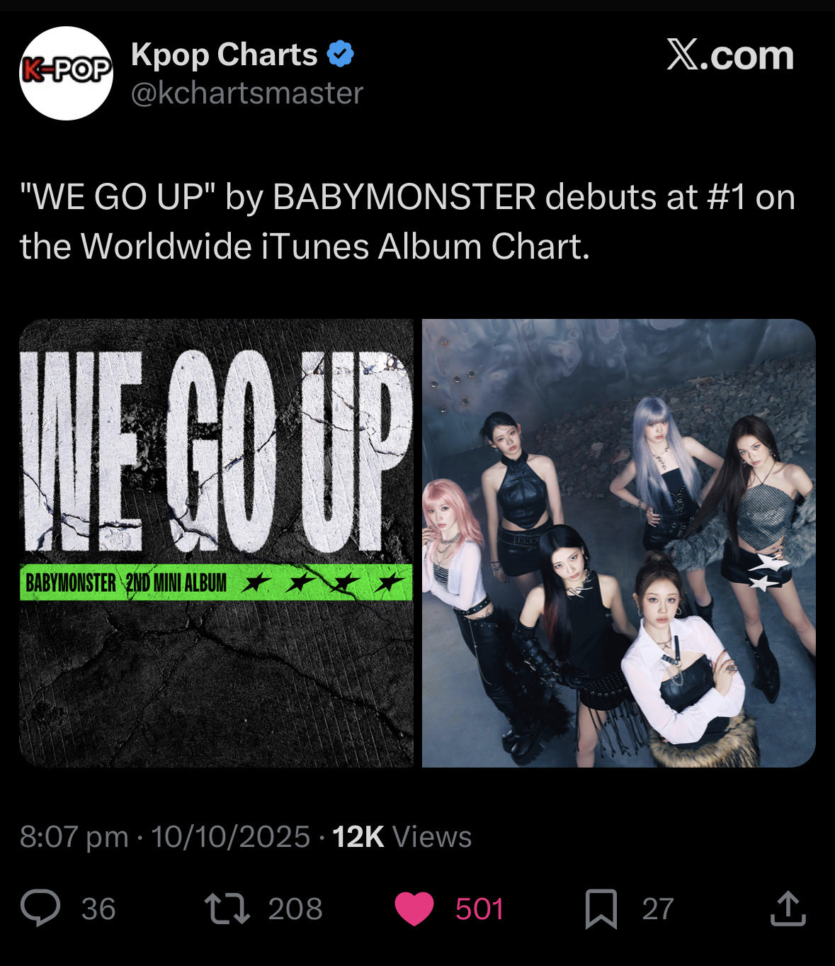 อัลบั้ม WE GO UP ของ BABYMONSTER ทำยอดขายวันแรกได้ที่ 261,650 อัลบั้ม ทำลายสถิติเดิมที่อัลบั้ม DRIP ทำไว้ 133,450 อัลบั้ม แบบขาดลอย 2 เท่าตัว ส่วนอัลบั้มแรก ของเบม่อนคือ BABYMONS7ER เคยทำไว้ เพียง