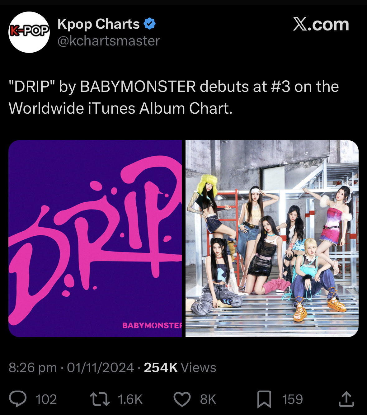 อัลบั้ม WE GO UP ของ BABYMONSTER ทำยอดขายวันแรกที่ 261,650 อัลบั้มทำลายสถิติเดิมที่อัลบั้ม DRIP เคยทำไว้ 133,450 อัลบั้ม