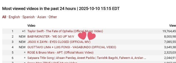 เพลง WE GO UP เป็น MV ที่มียอดวิวสูงที่สุดเป็นอันดับ 2 ของโลก ใน 24 ชั่วโมงที่ผ่านมา เป็นรองแค่เพลง The Fate of Ophelia