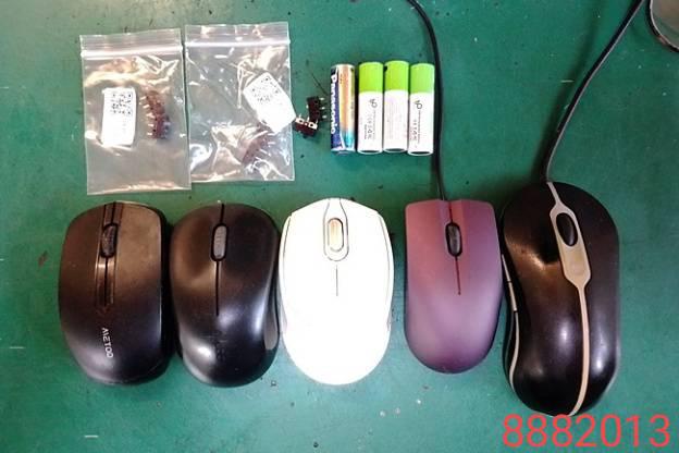 ภาพแสดงเมาส์คอมพิวเตอร์แบบมีสายและไร้สายหลายตัว พร้อมด้วยแบตเตอรี่และอุปกรณ์เสริมอื่นๆ โดยมีรายละเอียดดังนี้: