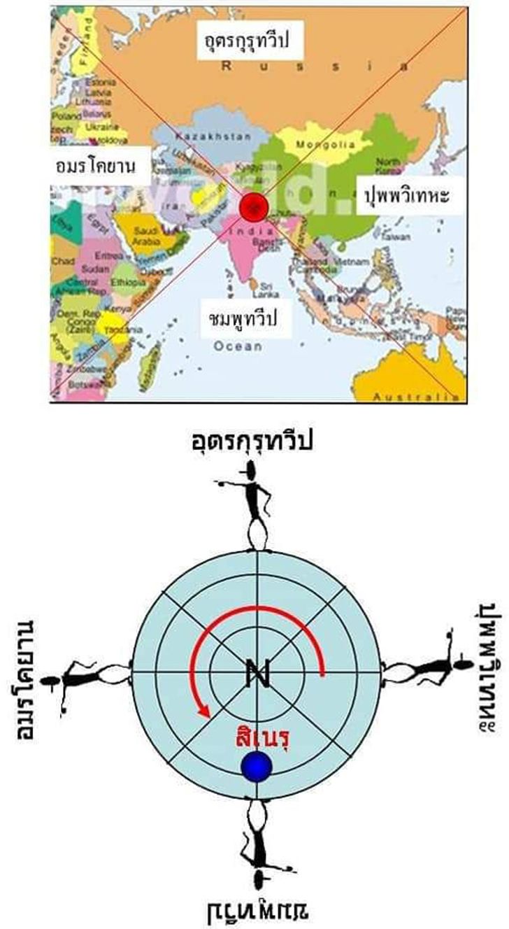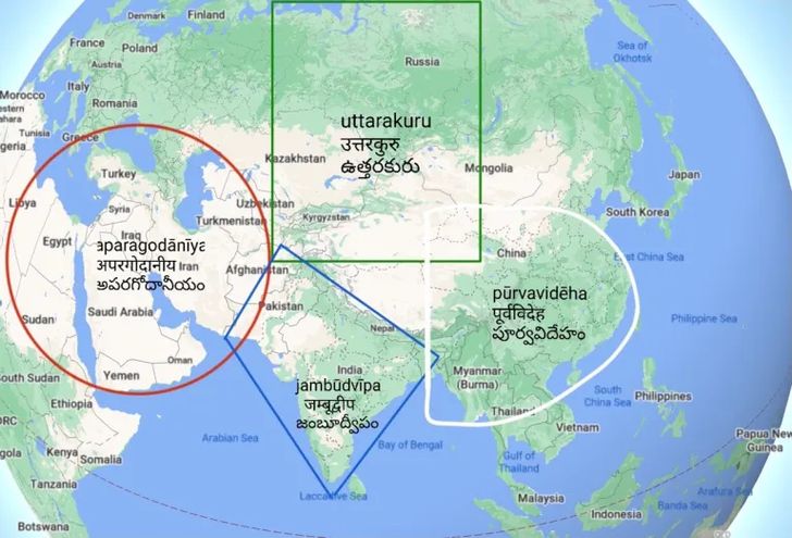 ในคัมภีร์ระบุว่า โลกแบ่งออกเป็น 4 ทวีปใหญ่ ได้แก่ อุตตรกุรุทวีป (อยู่เหนือ), บุรพวิเทหทวีป (อยู่ตะวันออก),
