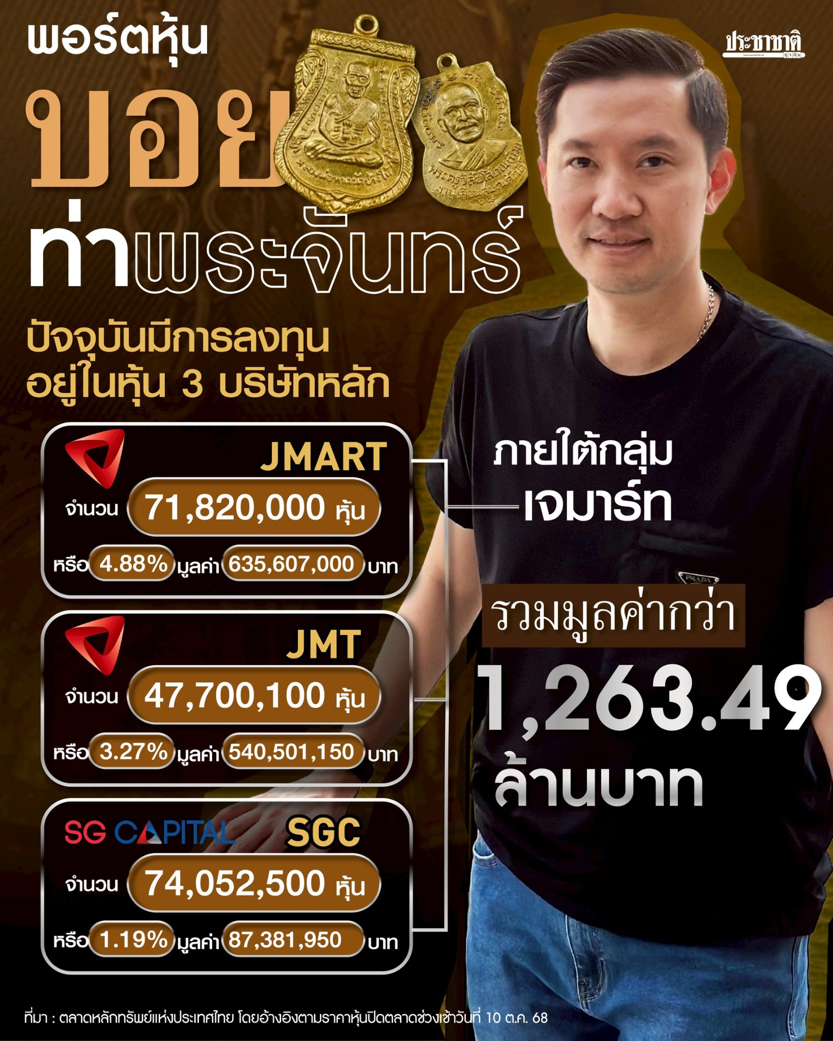 เปิดพอร์ตหุ้น “บอย ท่าพระจันทร์” เซียนพระชื่อดัง รวมมูลค่าการถือครองทั้งสิ้นกว่า 1.26 พันล้านบาท ลงทุนกระจุกในเครือเจมาร์ท 3 บริษัท ทั้ง JMART–JMT–SGC