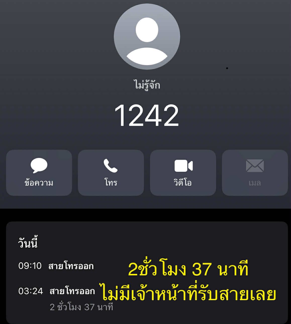เรื่องของเรื่อง เมื่อคืนก่อนนอน ได้โทร 1242 ตอนตี3กว่า ช่วงรอพนักงานรับสาย แล้วเผลอหลับไป , แล้วสะดุ้งตื่นอีกที มาดูโทรศัพท์ยังรอสายอยู่ ,!!! ช_ห แล้ว ค่าโทรตู หมดไปเท่าไหร่ว่ะเนี่ย !!2ชั่วโมง 37นาที !! คืออยากแชร์ว่า ทำไมไม่มีเจ้าหน้าที่รับสายเลย เวลารอนานขนาดนั้นครับ
