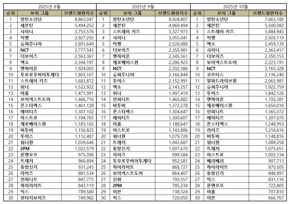 Stray Kids อยู่อันดับที่ 3 ด้วยดัชนีชื่อเสียงแบรนด์ 3,484,943 ดัชนีการมีส่วนร่วม 123,095 ดัชนีสื่อ 885,254 ดัชนีการสื่อสาร 859,747 และดัชนีชุมชน 1,616,848 เมื่อเทียบกับดัชนีชื่อเสียงแบรนด์ 3,327,973 ในเดือนกันยายน ดัชนีนี้เพิ่มขึ้น 4.72%