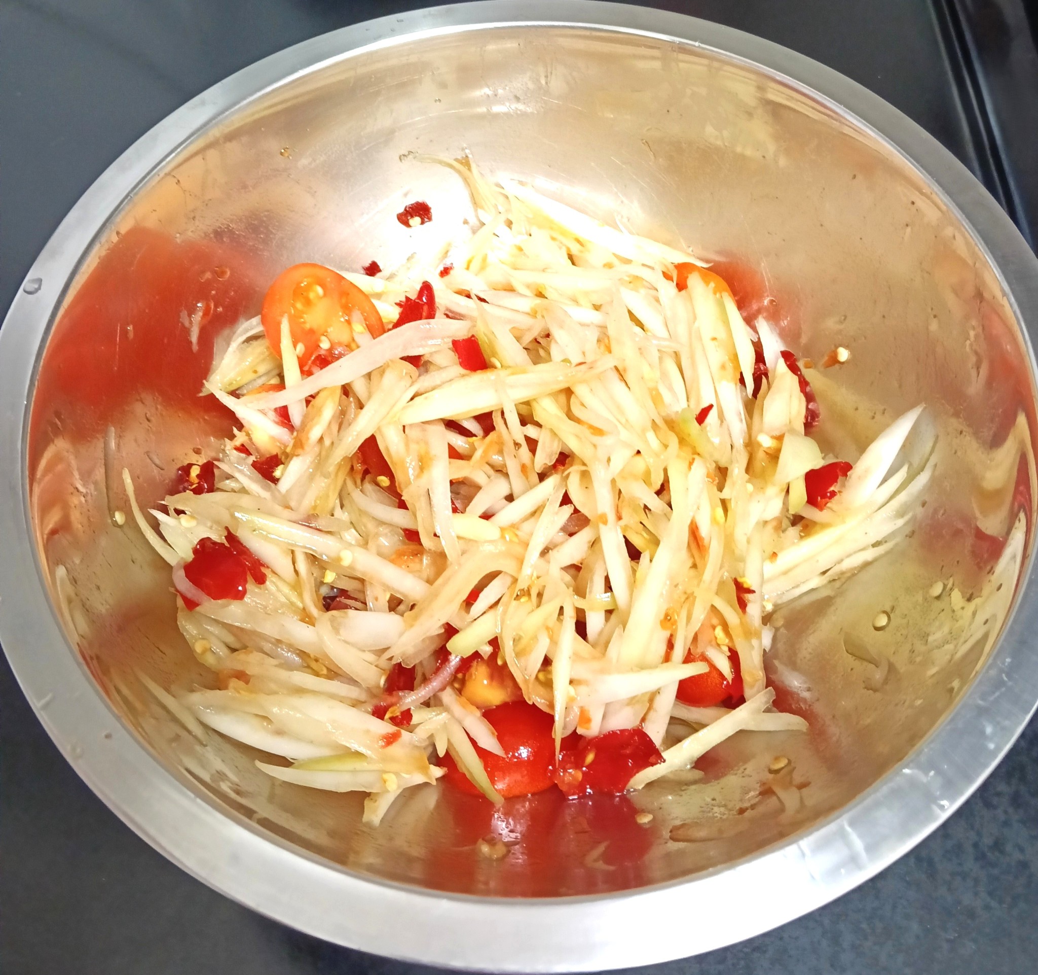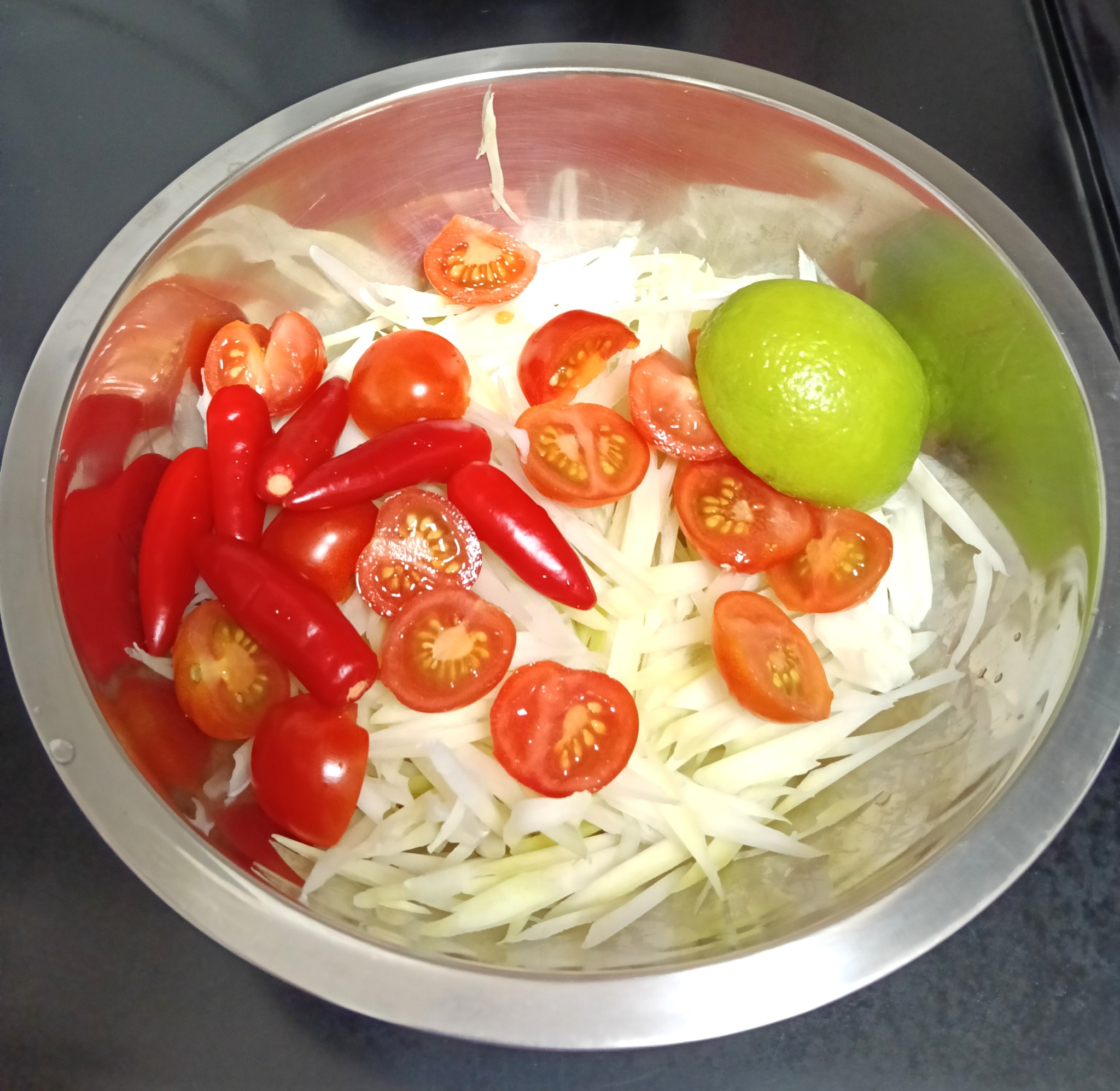 สับมะละกอเป็นเส้นตามชอบเตรียมไว้รอ