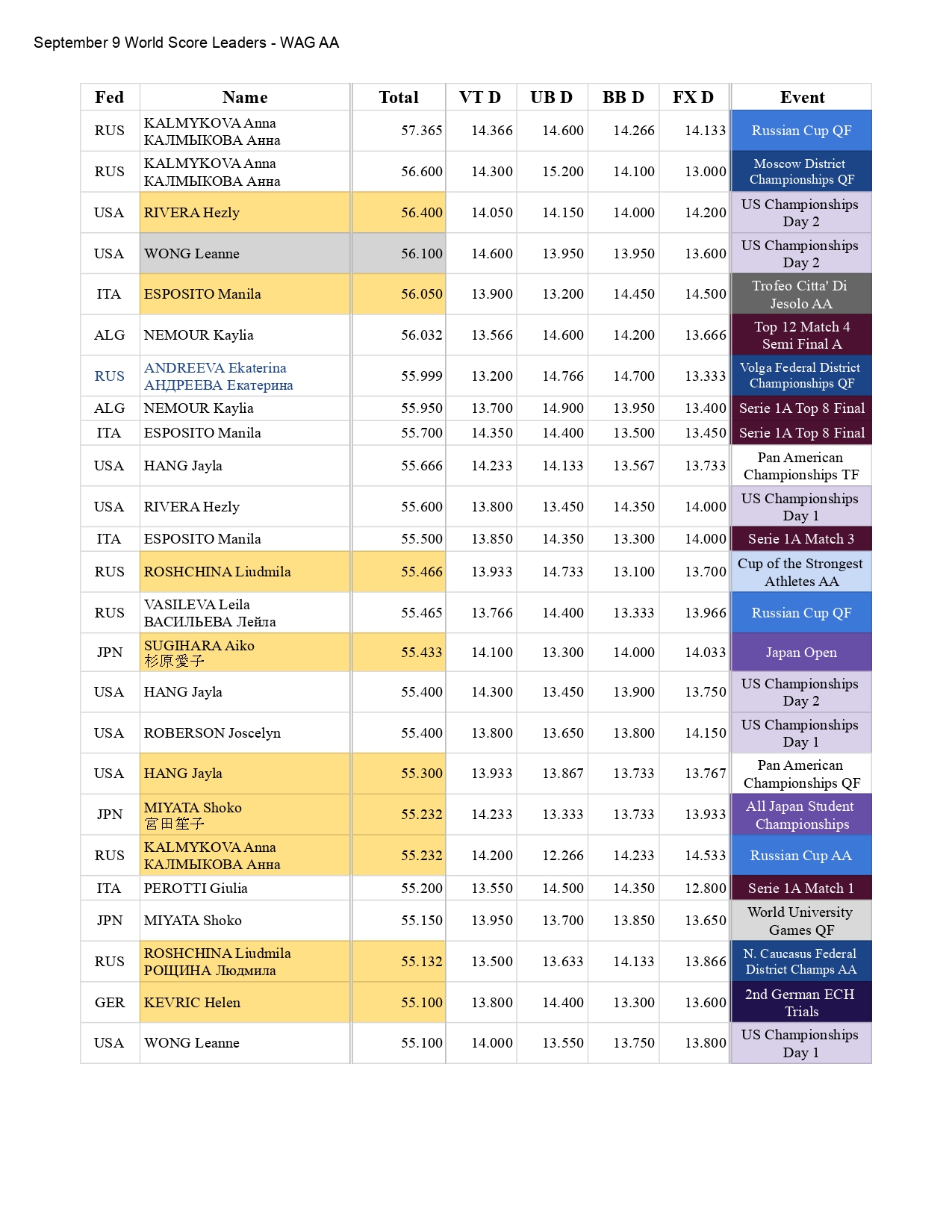 รายการยิมนาสติกชิงแชมป์โลก 2015 (2015 Artistic Worlds, Glasgow (GBR), 23 October - 1 November 2015) รอบชิงชนะเลิศในประเภทบุคคลหญิง อุปกรณ์บาร์ต่างระดับ (Uneven bers) ปรากฏว่ามีนักกีฬาได้คะแนนอันดับ 1