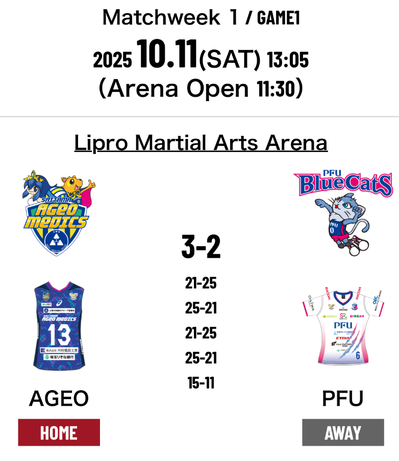 2.Saitama Ageo Medics 3-2 PFU Blue Cats (21-25 25-21 21-25 25-21 15-11) (107-103)