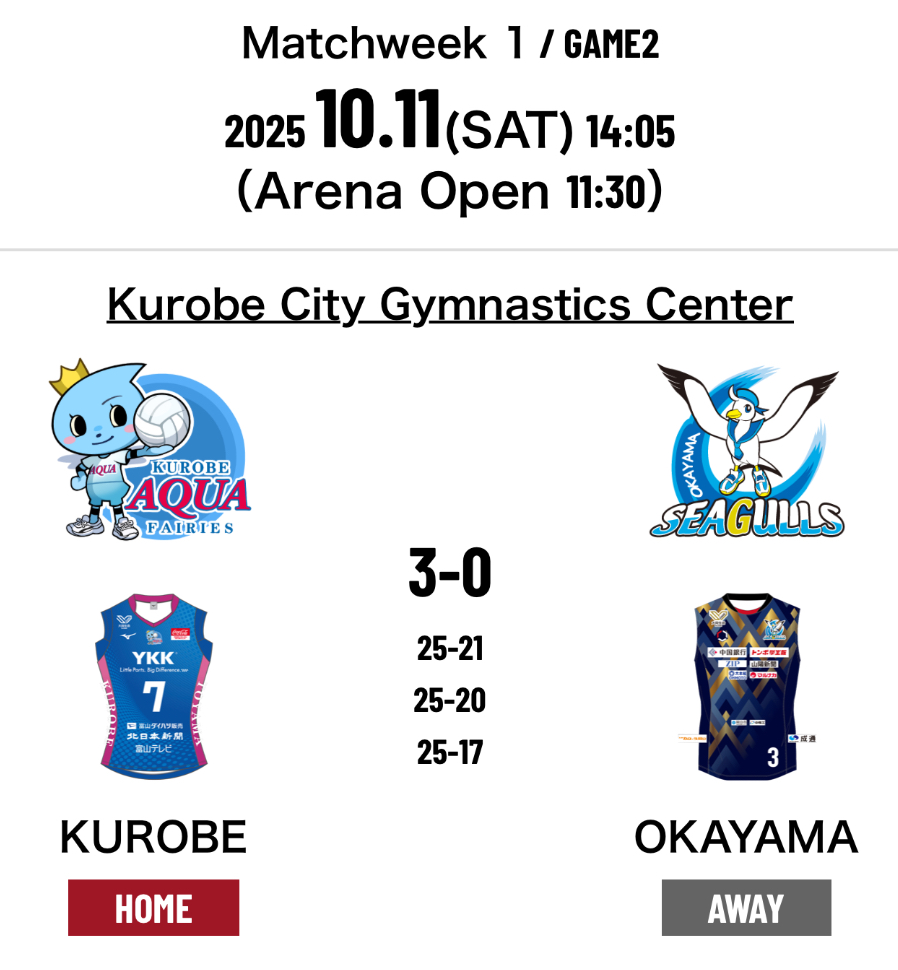 3.Kurobe Aqua Fairies 3-0 Okayama Seagulls (25-21 25-20 25-17) (75-58)