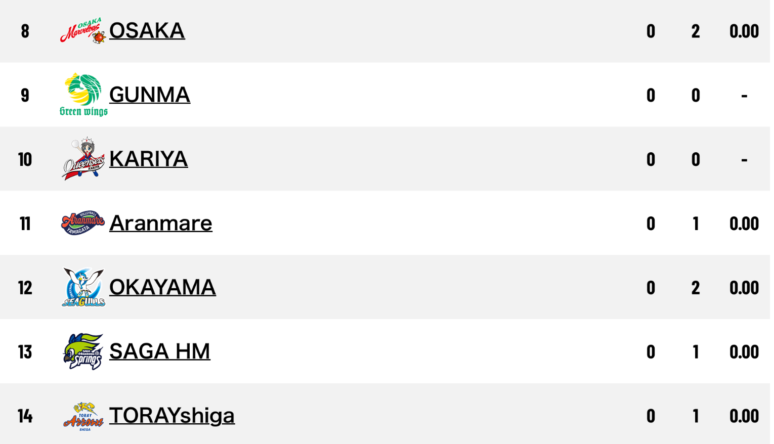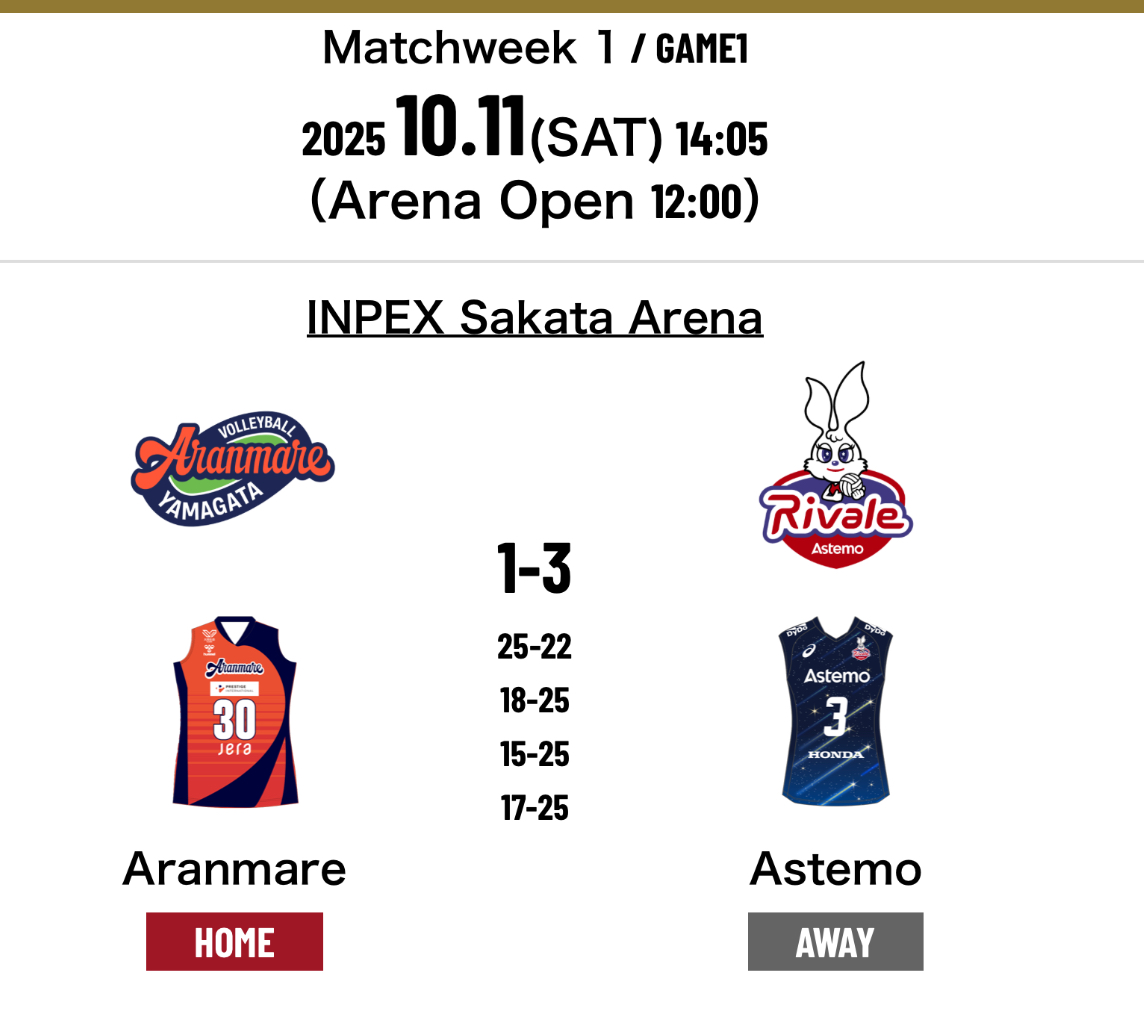 4.Aranmare Yamagata 1-3 Astemo Rivale Ibaraki (25-22 18-25 15-25 17-25) (75-97)