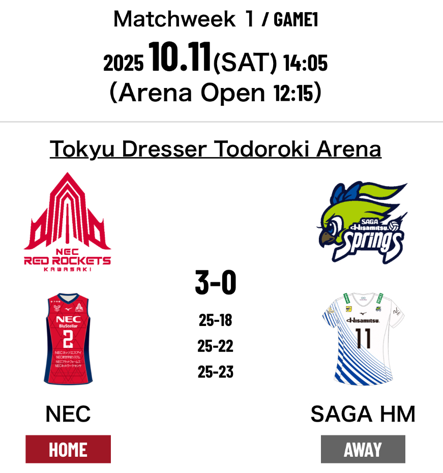 5.NEC Red Rockets Kawasaki 3-0 SAGA Hisamitsu Springs (25-18 25-22 25-23) (75-63)