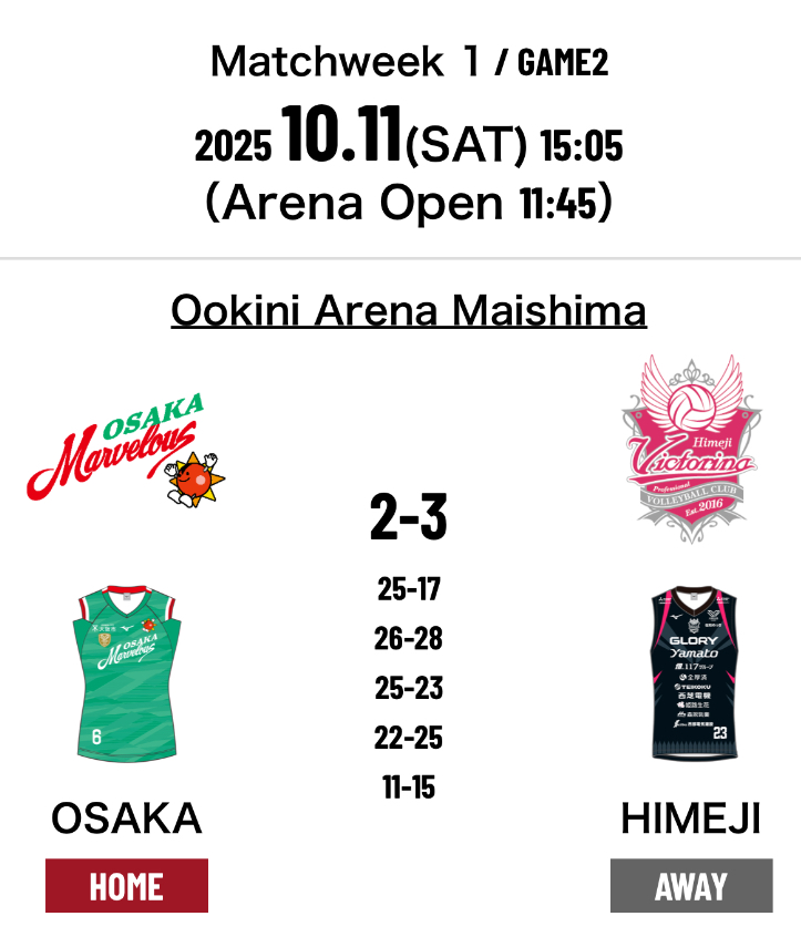 6.Osaka Marvelous 2-3 Victorina Himeji (25-17 26-28 25-23 22-25 11-15)