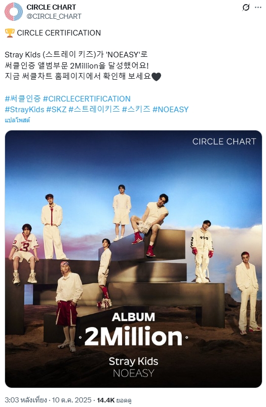 🔥 Stray Kids “NOEASY” ได้รับการรับรอง 2Million จาก Circle Chart จากการมียอดขายเกิน 2 ล้านชุด (โดยสมาคมเนื้อหาเพลงแห่งเกาหลี Korea Music Content Association -KMCA)
