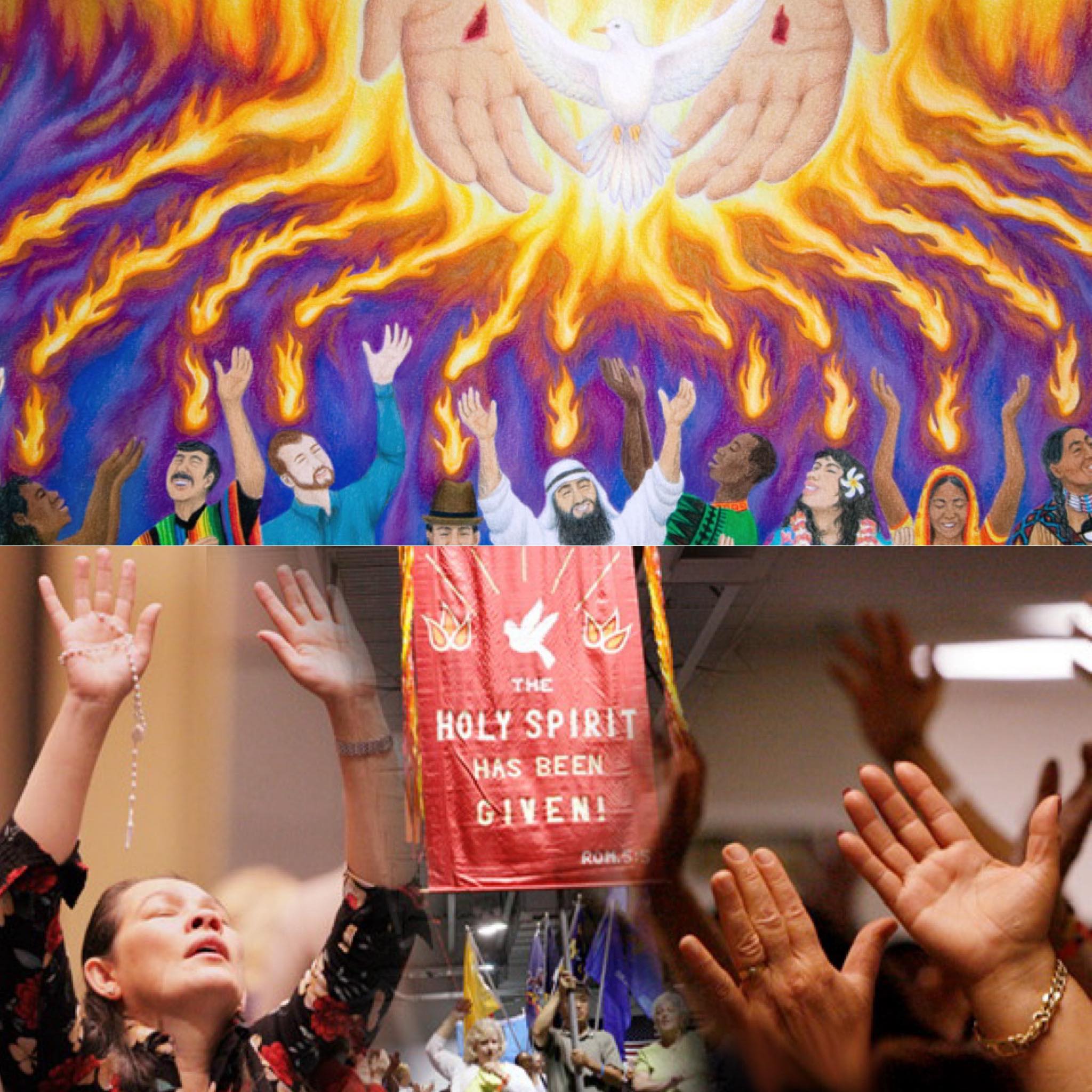 + เขาเห็นเปลวไฟลักษณะเหมือนลิ้นแยกไปอยู่เหนือศีรษะของเขาแต่ละคน ทุกคนได้รับพระจิตเจ้าเต็มเปี่ยม และเริ่มพูดภาษาอื่นๆ ตามที่พระจิตเจ้าประทานให้พูด - กิจการ 2:3-4 วันเปนเตกอสเต
