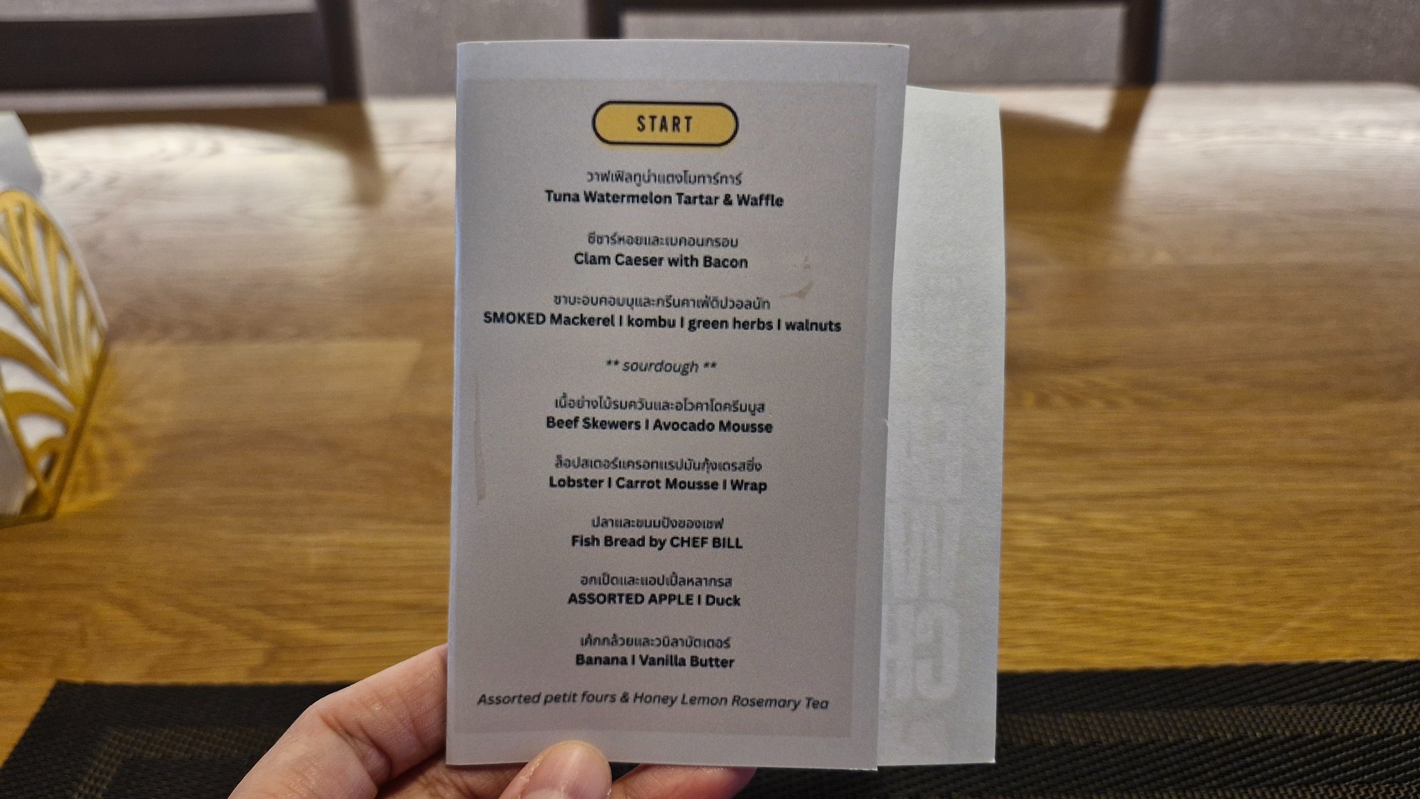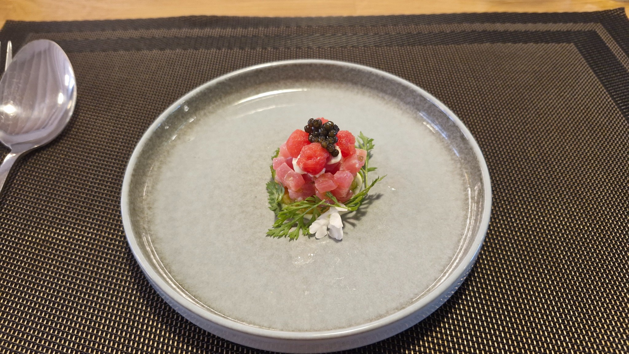 พอถึงเวลาของอาหาร จานแรกเชฟเสิร์ฟมาในรูปแบบของทูน่าที่ทานคู่กับแตงโม ตักเข้าไปแต่ละคำคือเฟรช สดชื่น เหมาะแก่การเรียกน้ำย่อยสุดๆ