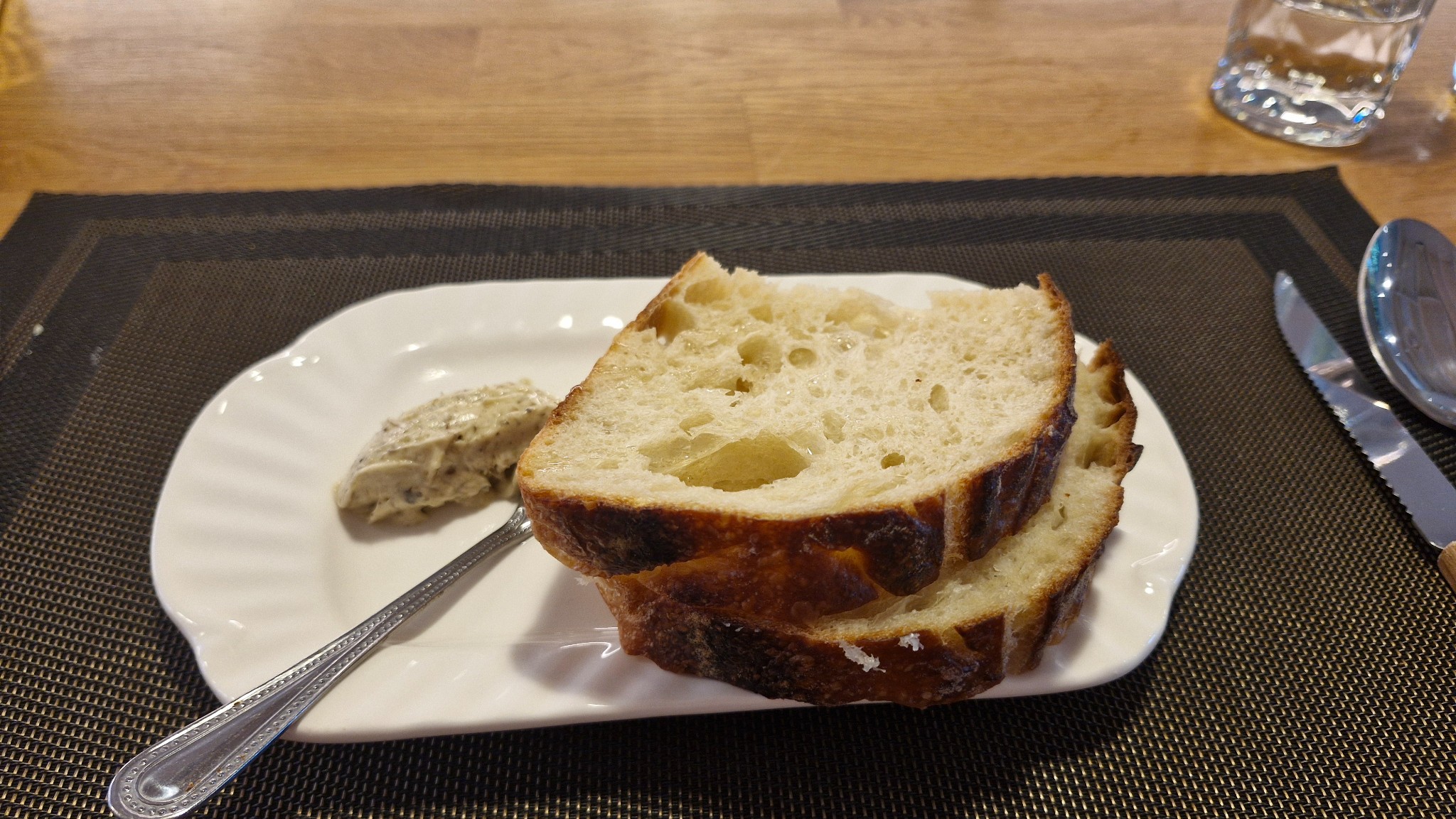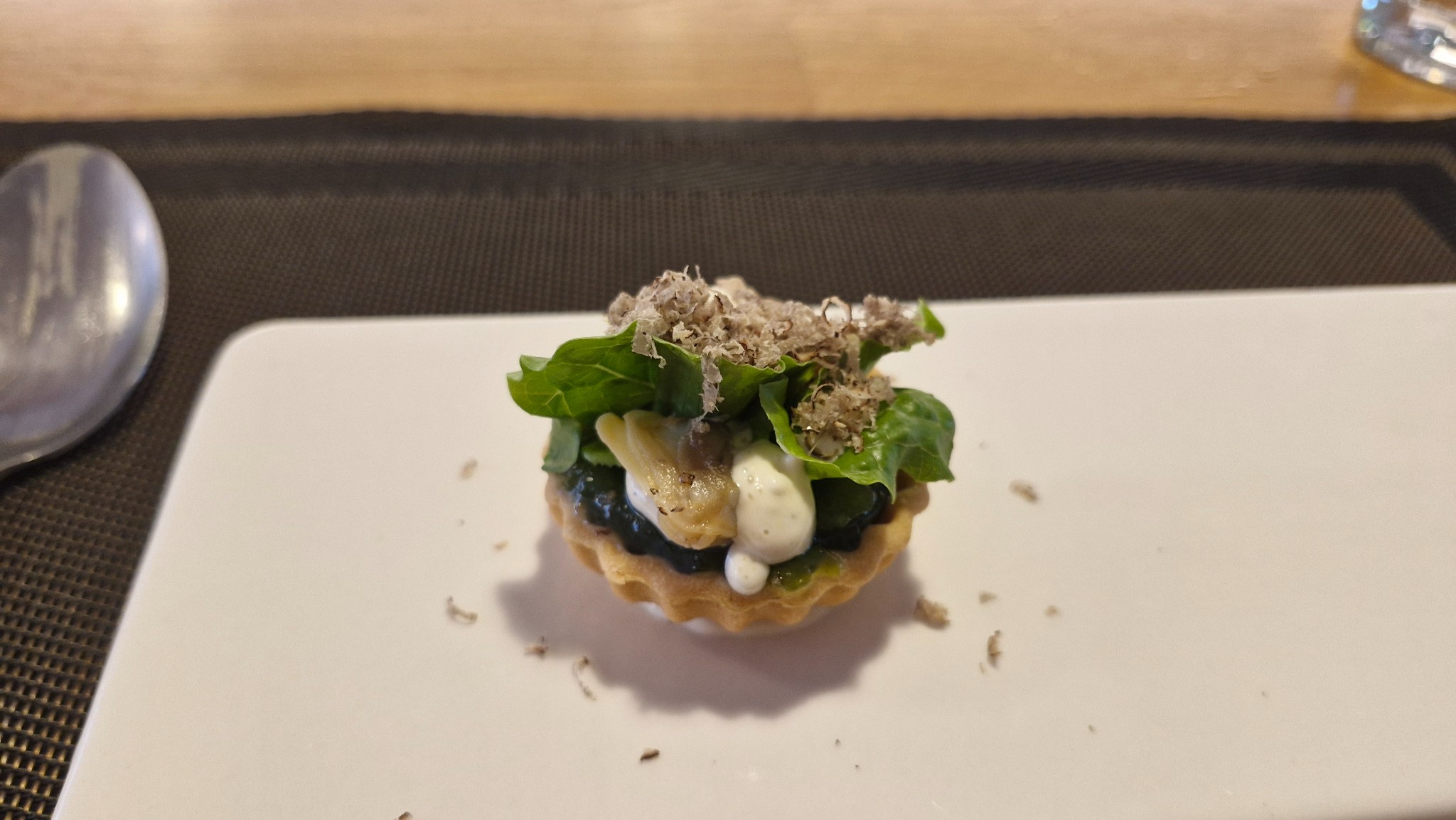 รอไม่นานหอยพร้อมเบคอนกรอบกับทาร์ตก็ถึงคิวออกโรงกับเขาแล้ว ที่น่าเซอร์ไพร์สของจานนี้คือเชฟเอาผักคอสมาทำเจลลี่ ภาพในหัวของคนที่ไม่ได้ทำงานสายร้านอาหารคืองงเต็ก แต่พอนึกขึ้นได้ว่าเชฟเคยทำไอศครีมแซลมอนก็เลยลดความแปลกใจไปได้นิดนึง เป็นจานที่มานวลๆครีมๆแต่ไม่เลี่ยนเลย เหมือนว่าเชฟคัดสรรมาอย่างดีแล้วเลือกทุกอย่างได้เข้ากันไปหมด