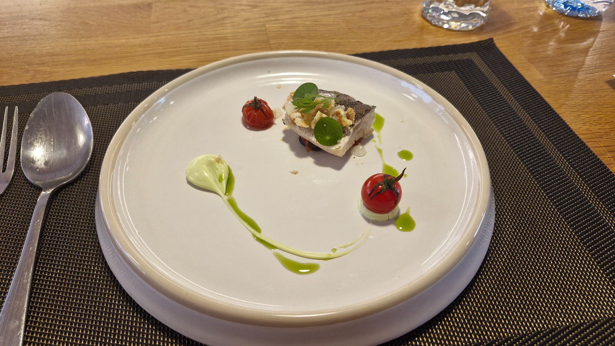 จานถัดไปเชฟแจ้งว่าเปลี่ยนจากปลาซาบะเป็นปลาน้ำดอกไม้ มะเขือเทศสองลูกที่ปรุงมาคนละแบบ แน่นอนว่าทาสรักมะเขือเทศแบบเราย่อมเลือกไม่ได้อยู่แล้วว่าลูกไหนอร่อยว่า รวมถึงสิ่งที่อยู่ใต้ปลานั่นเราก็ไม่รู้ว่าคืออะไร แต่ทุกอย่างในจานก็ยังคงเข้ากันได้ดีเหมือนที่จานผ่านๆมา