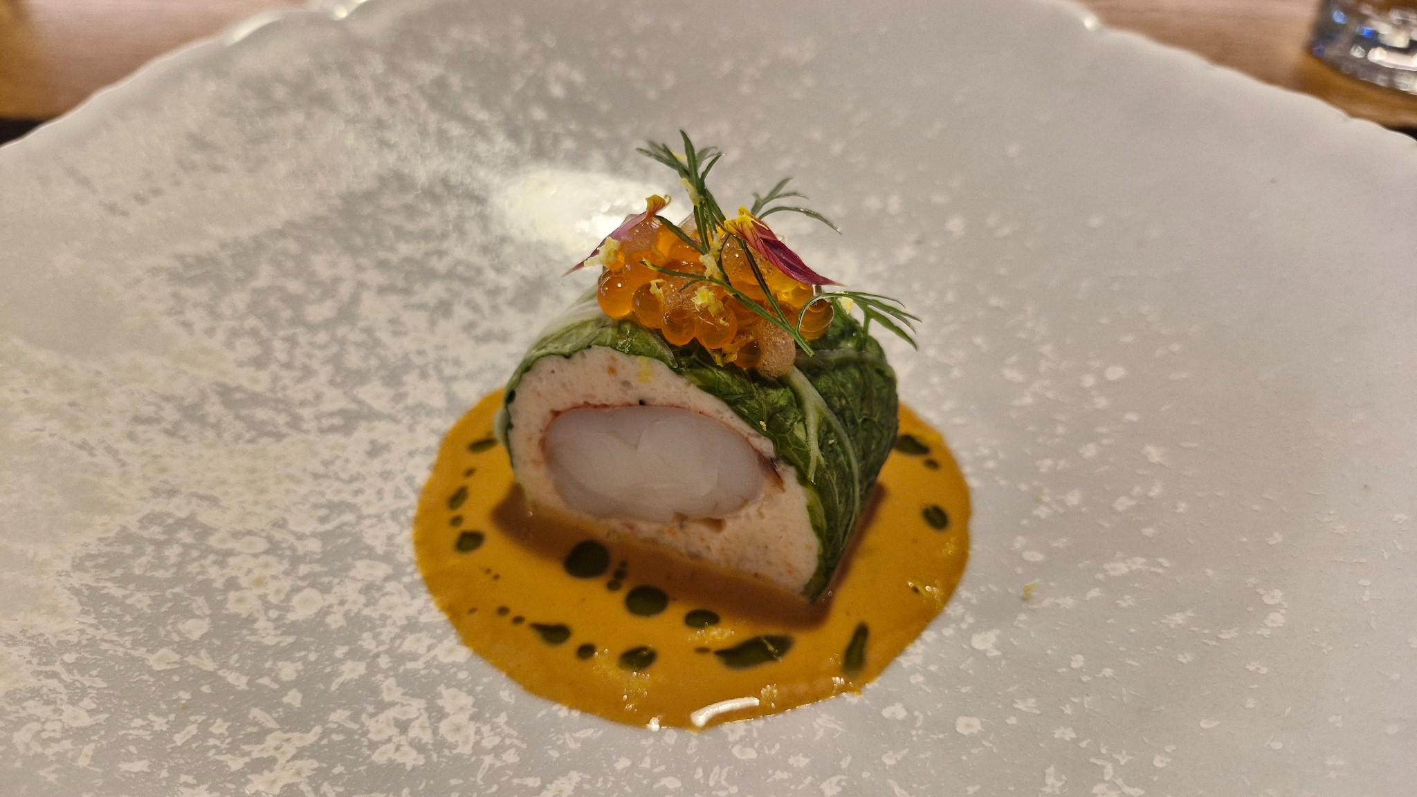 จานนี้เป็นกุ้ง ซอสก็เป็นมันกุ้งล้วนๆที่เคี่ยวจนหอม ส่วนชั้นในสุดนั่นก็เป็นล็อปสเตอร์ อีกสิ่งที่ขอชมเชฟเลยคือเขาบาลานซ์โปรตีนกับซอสได้ดี ทานด้วยกันแล้วซอสหมดพร้อมโปรตีน