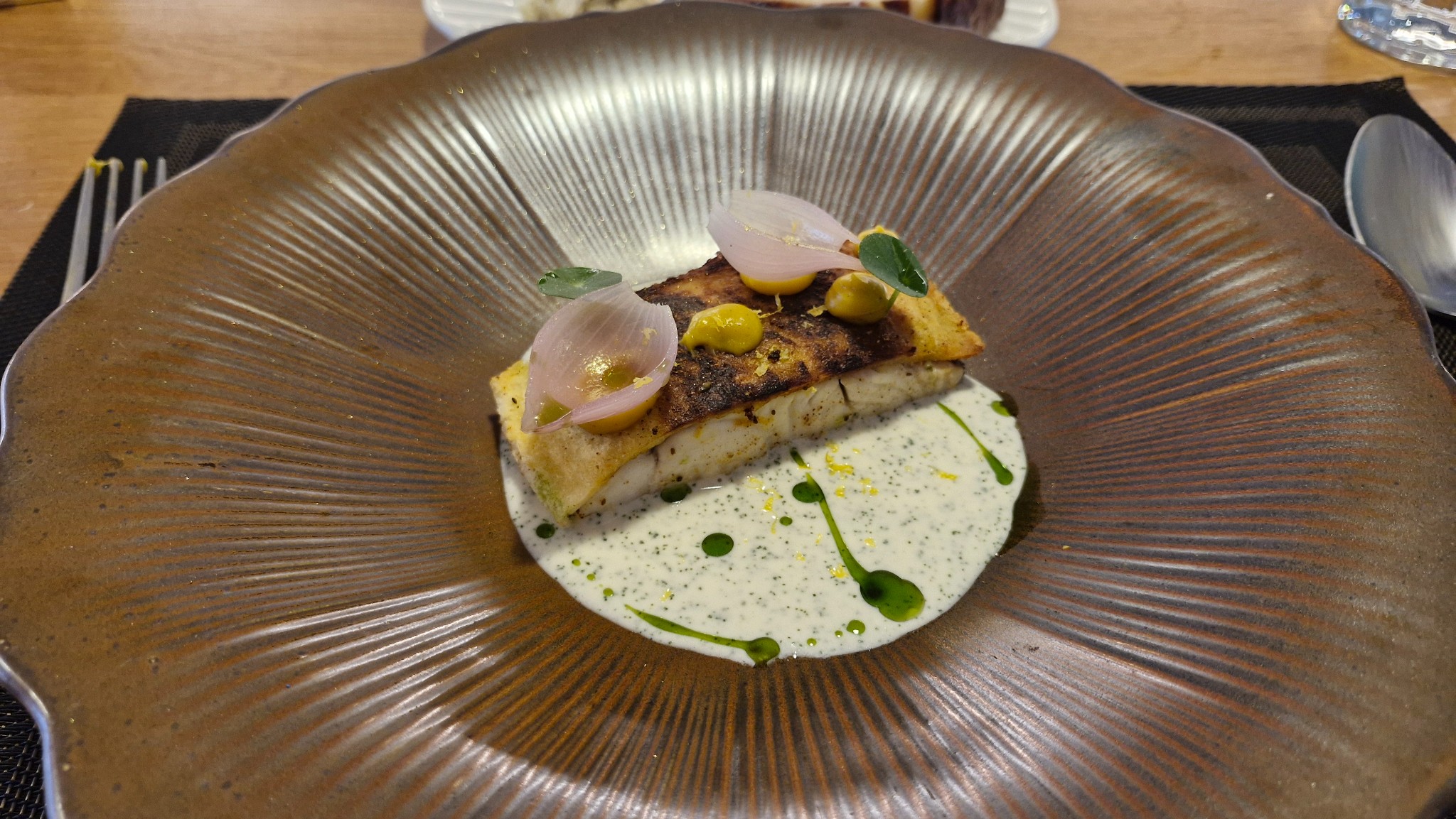 ตามด้วยปลา เสียดายที่ความระยิบระยับของทองไม่ค่อยเข้ากล้อง แต่เราที่มองจากสายตามันคือท๊องงงงง ล้อเล่น ปลาและขนมปังที่อร่อยๆรวมถึงหอมแดงที่เชฟมักเอาไว้แต่งจานในงานต่างๆก็อร่อยเช่นกัน