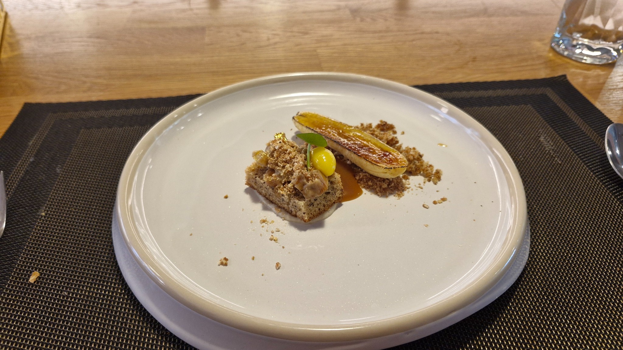 เราที่อยากรู้ว่าคนไม่ชอบกลิ่นกล้วยแบบเราจะว่าอย่างไรกับจานนี้ เป็นจานที่เชฟแจ้งมาว่ามีแต่ใบบัวบกกับแปะก๊วย ส่วนที่เหลือคือกล้วยที่แปลว่าปล้วยจริงๆ ทานเข้าไปแล้วไม่รู้สึกเลยว่าทานยาก มันคือกล้วยที่จัดการกับกลิ่นกล้วยก็ดี