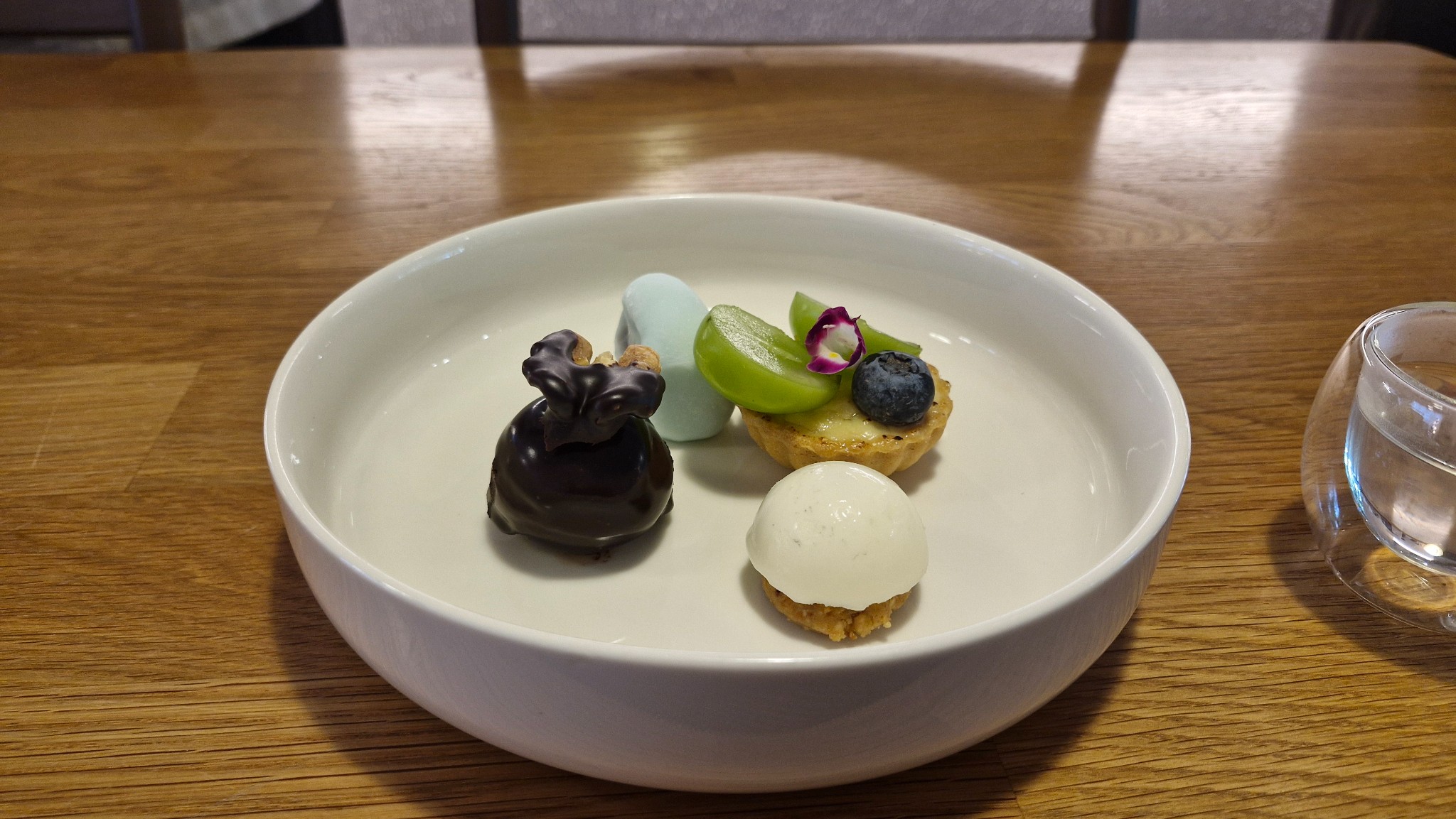 ตามด้วยขนมหวานจานที่2 มาในรูปแบบของpetit four คำแรกล้างปาก ช็อคโกแลตเข้มๆที่คำสอง โมจินุ่มๆคำสาม แล้วล้างปากด้วยทาร์ตผลไม้คำสี่ ยิ่งทานคู่กับชาร้อนเป็นอะไรที่ล้างปากทั้งหมดทั้งมวลได้ดี