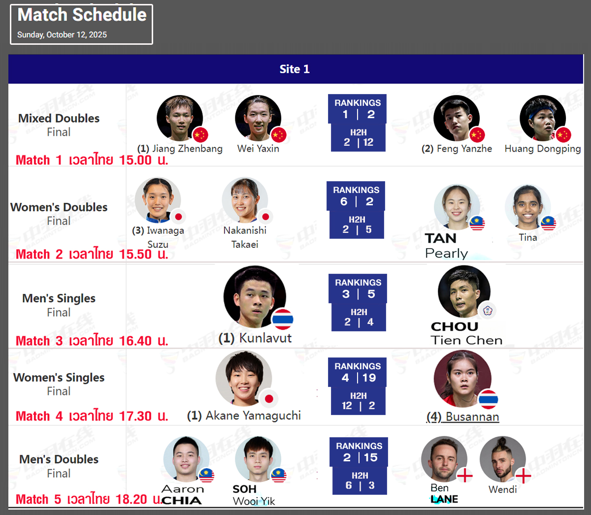 [เว็บจีน] [เลือกวัน 7/10] : https://www.badmintoncn.com/tournament_match.php?tid=1171&date=2025-10-12